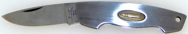 Complete stainless steel constructed handle with sterling silver inlaid bullet oval shield. High polished drop point blade. Real strong open and close snap. Lanyard hole. Great stainless steel pocket knife by Hen & Rooster out of Solingen, Germany. Like new condition, no box.