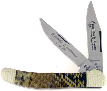 Awesome genuine rattlesnake skin handle scales that are covered with acrylic to protect them. Stainless steel swedged clip point blade etched HEN & ROOSTER WORLD'S FINEST CUTLERY and swedged drop point blade etched COMBS CUSTOMS 1 0F 50. Both blades have good snap. Brass liners. Fancy fluted and sculpted nickel silver bolsters. Comes brand new in a hardwood Combs Customs cedar display box.