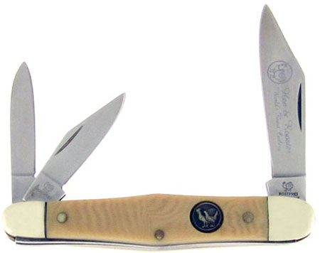 Awesome waterfall celluloid handle scales. Mirror polished stainless steel swedged clip point blade etched HEN & ROOSTER WORLDS FINEST CUTLERY with logo, swedged spear point blade, and small clip point blade. All three blades have good strong snap. Nickel silver bolsters and handle pins. Brass liners and inlaid logo shield. Wonderful Hen & Rooster pocket knife. Comes new in box.
