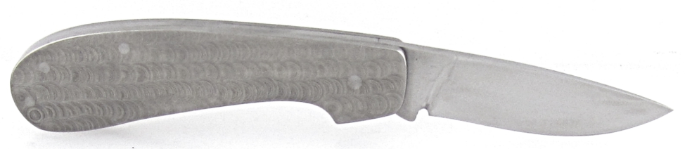 Awesome machine swirl finished titanium handle scales. The front has a black shield. Polished stainless steel drop point blade with deep nail knick. The blade has good strong open, close and half snap. Tang stamped HJ. A great custom handmade pocket knife by Herb Johnson. Herb's knives were made to be used and it will be an excellent companion for someone!