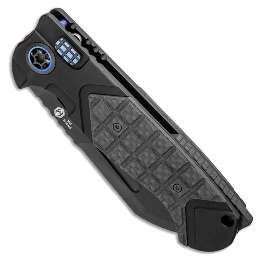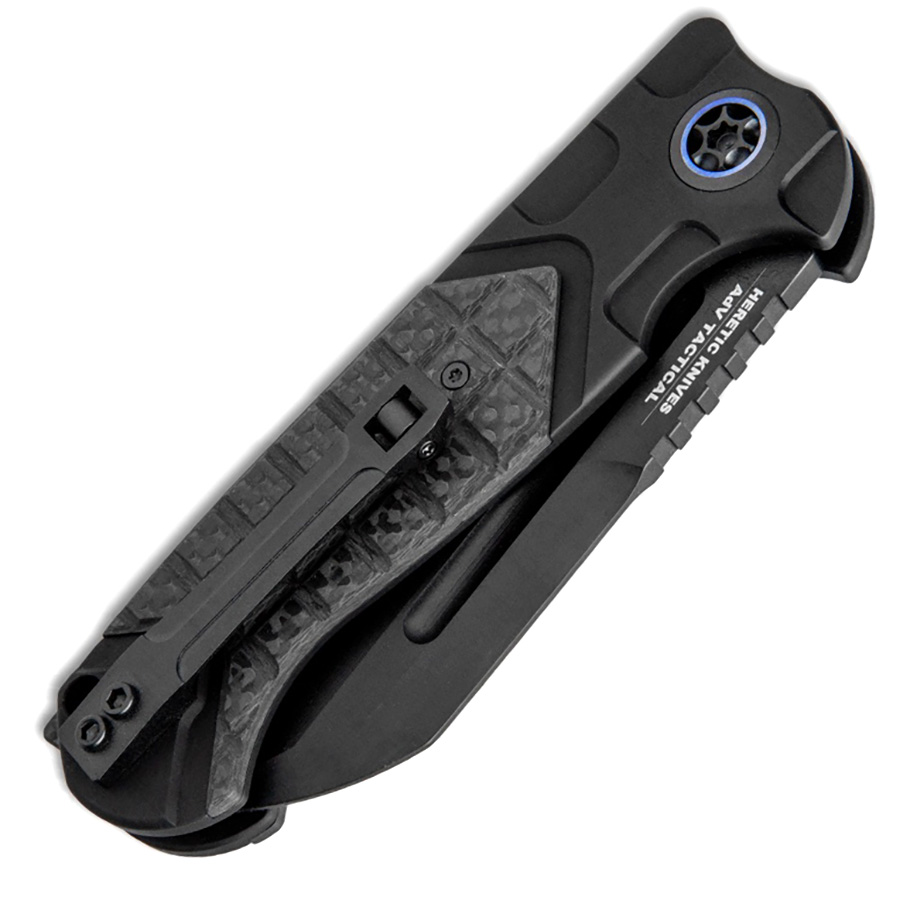 This model features black anodized 6061-T6 aluminum handle scales with frag patterned carbon fiber inlays on both sides. Black cerakote finished CPM-S35VN stainless steel sheepsfoot blade. The blade is etched with the model information, serial number, and Heretic logo. Carbon fiber back spacer. Blue accented titanium hardware and rollerball pocket clip. Lanyard hole. Brand new in box.
