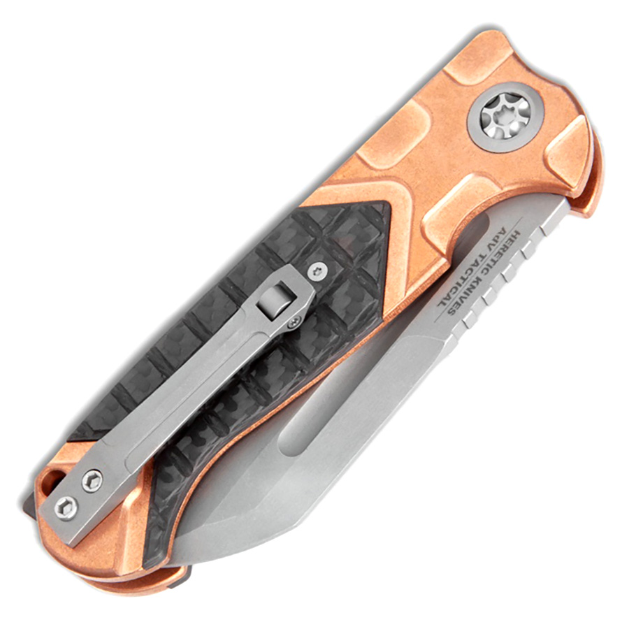 This model features solid copper handle scales with frag patterned carbon fiber inlays on both sides. Stonewash finished CPM-S35VN stainless steel sheepsfoot blade. The blade is etched with the model information, serial number, and Heretic logo. Carbon fiber back spacer. Stonewash finished hardware and rollerball pocket clip. Lanyard hole. Brand new in box.