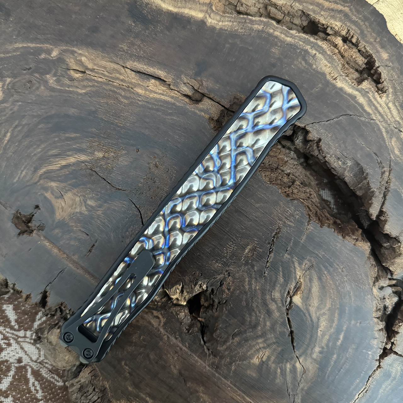 This model features black handle with a flamed titanium bubble inlay. Black DLC finished double edge dagger CPM-MagnaCut blade. Black finished hardware and pocket clip. The side of the frame is etched with the Heretic logo, model information, and serial number. Brand new in box.