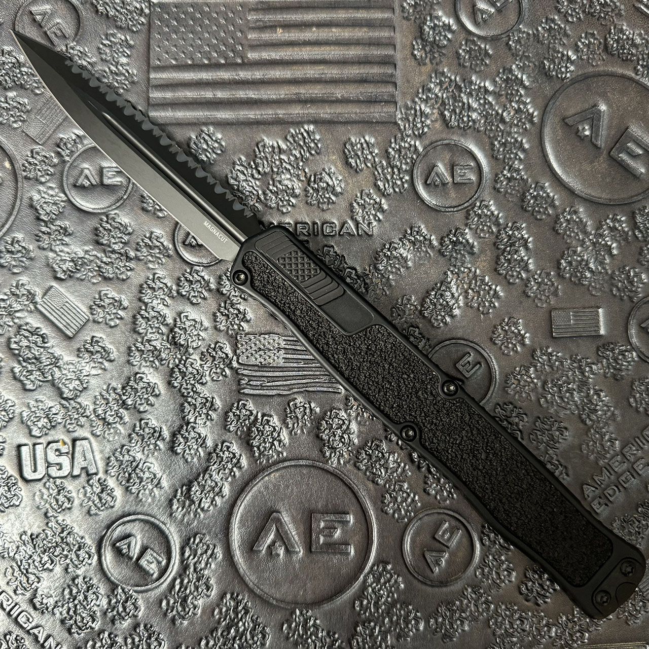 This model features a black handle with a black grip tape inlay. Black DLC finished serrated double edge dagger CPM-MagnaCut blade. Black finished hardware and pocket clip. The side of the frame is etched with the Heretic logo, model information, and serial number. Brand new in box.