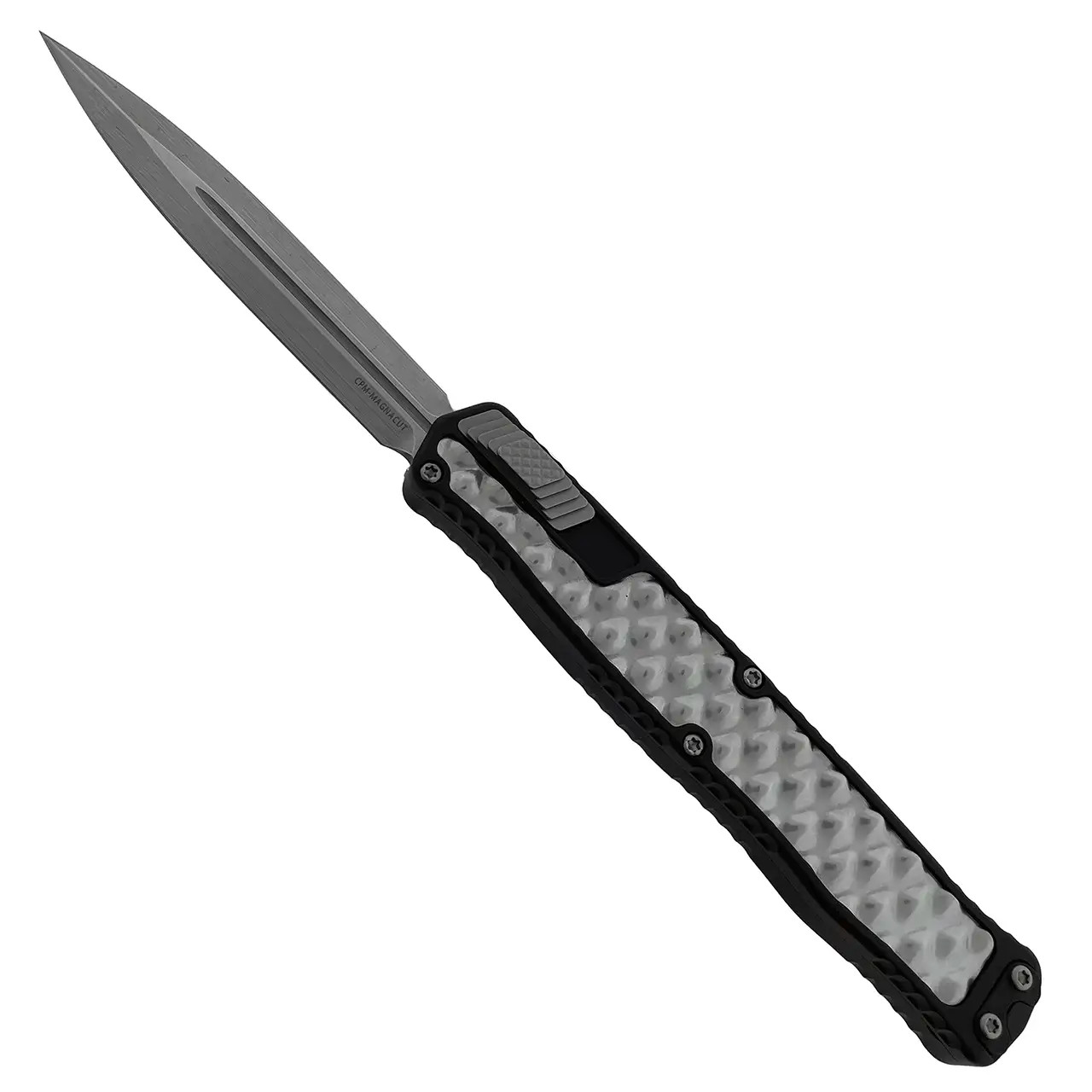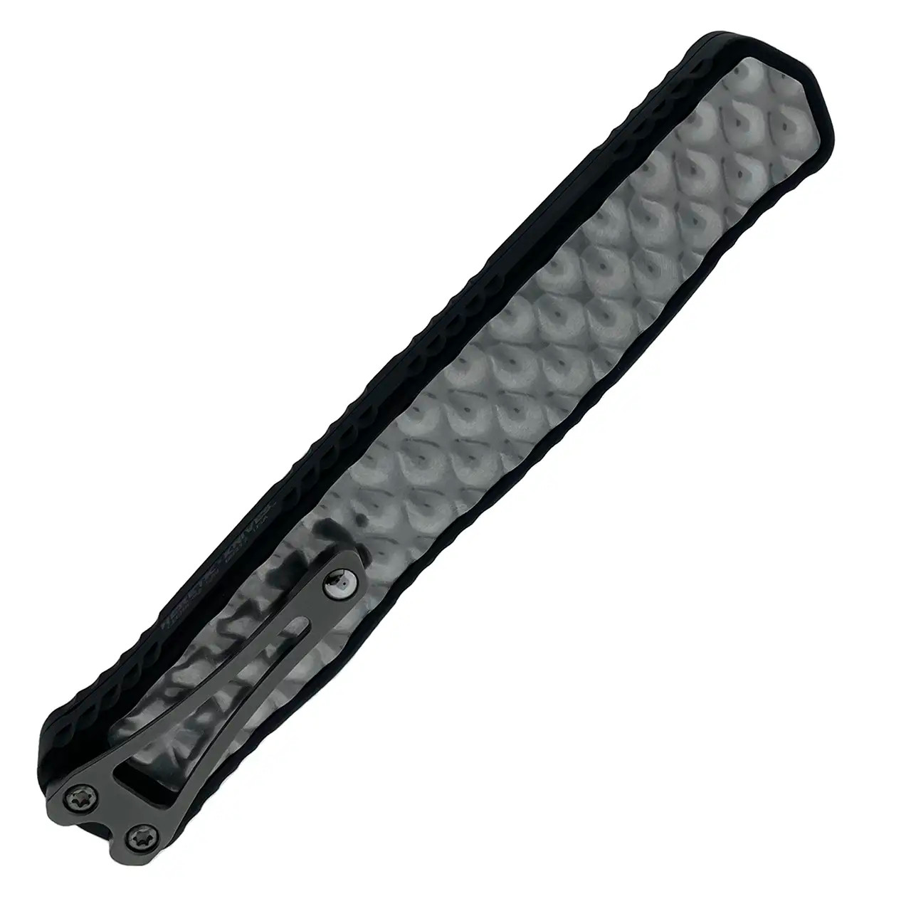 This model features black anodized aluminum handle scales with silver textured metal inlays on both sides. Stonewash finished CPM-Magnacut stainless steel double edge dagger blade with standard cutting edges. Bead blast finished hardware. Black finished milled titanium roller ball pocket clip. The side of the frame is etched with the Heretic logo, model information, and serial number. Brand new in box.