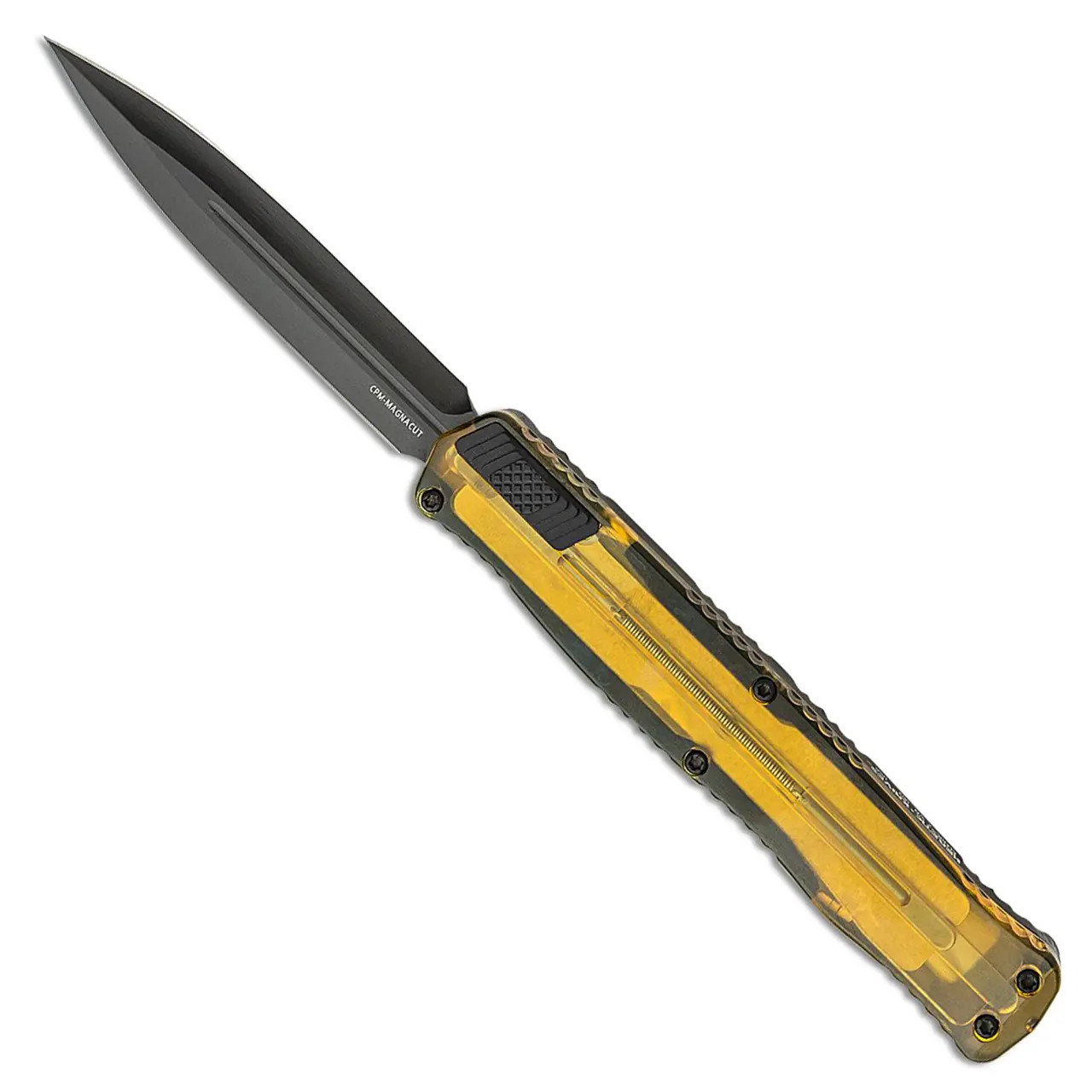 This Iconoclast Series limited model features a black handle with an ultem inlay and an Ultem top cover. Black DLC finished double edge dagger CPM-MagnaCut blade. Black finished hardware and pocket clip. The side of the frame is etched with the Heretic logo, model information, and serial number. Brand new in box.