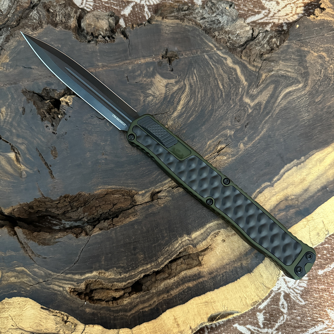 This model features an OD Green handle with a black bubble inlay, black DLC finished double edge dagger CPM-MagnaCut blade, and black finished hardware and pocket clip. The side of the frame is etched with the Heretic logo, model information, and serial number. Brand new in box.