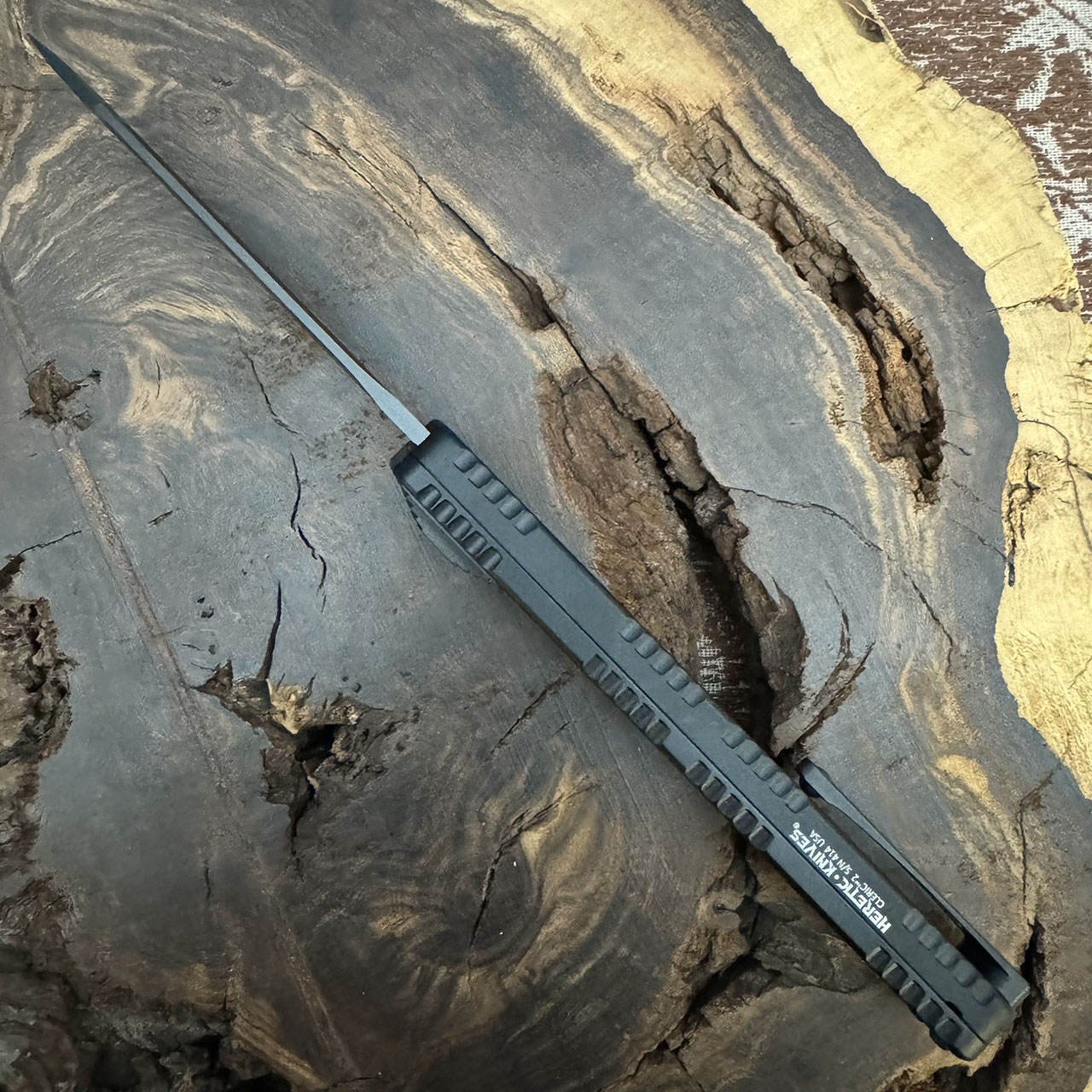 This model features a black handle with a white camo carbon inlay, black DLC finished tanto fully serrated CPM-MagnaCut blade, DLC finished hardware and a black pocket clip. The side of the frame is etched with the Heretic logo, model information, and serial number. Brand new in box.