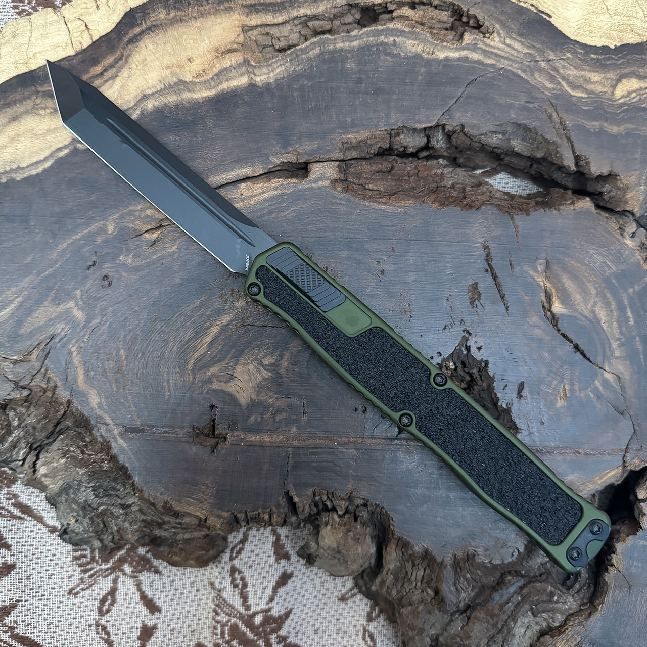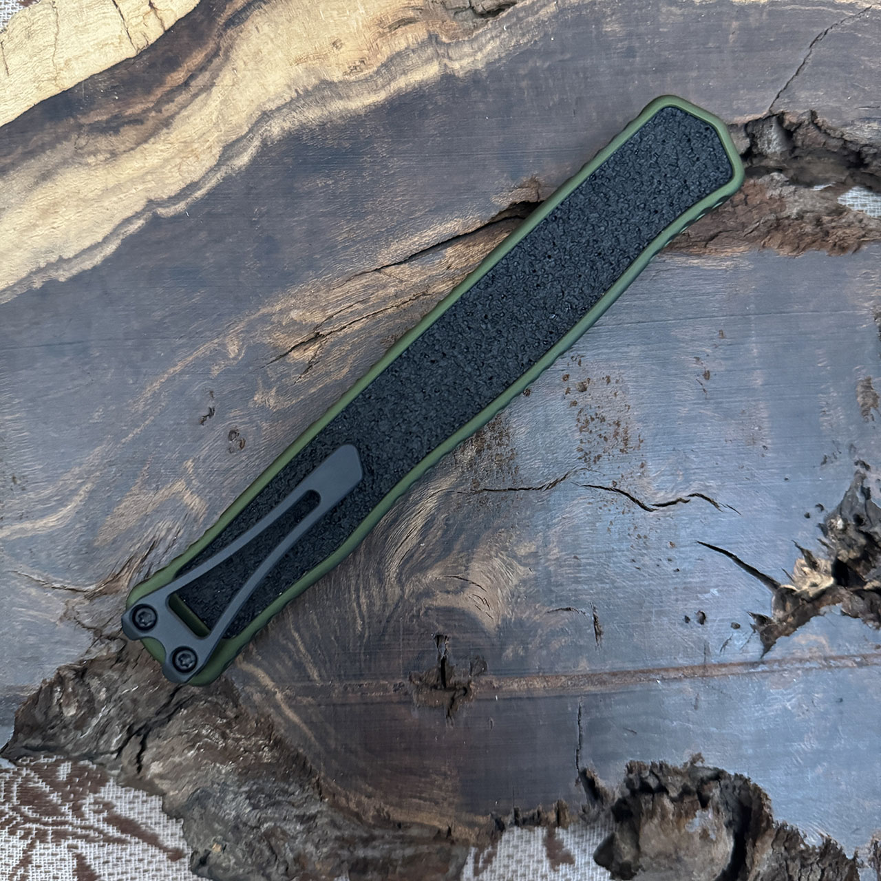 This model features an OD Green handle with a black grip inlay. Black DLC finished tanto edge CPM-MagnaCut blade. Black finished hardware and pocket clip. The side of the frame is etched with the Heretic logo, model information, and serial number. Brand new in box.