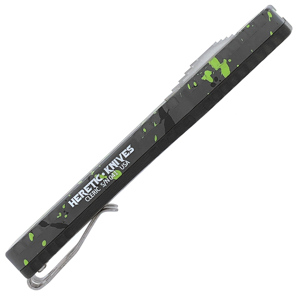 This limited edition Cleric OTF model features Green Splash Cerakote finished 6061-T6 aluminum top handle scales done by Elevated Arms. The bottom scale is carbon fiber. Stonewash finished 154-CM stainless steel tanto blade. Bead blast finished hardware and double pronged pocket clip. The side of the frame is etched with the Heretic logo, model information, and serial number. These limited models were released at Bladeshow 2018. New in box with Heretic Knives cloth bag.
