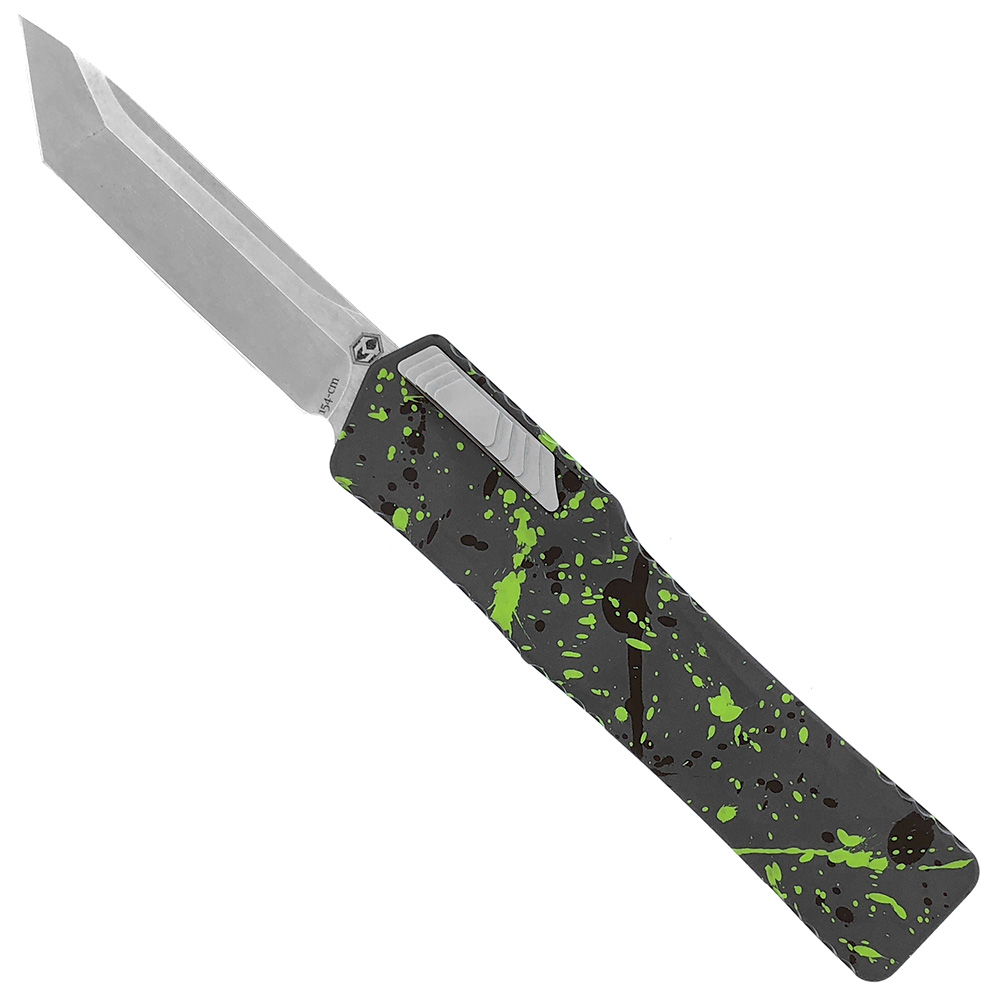 Heretic Knives Cleric OTF Auto Tanto Elevated Green Splash Stonewash Blade H015-2A-GS