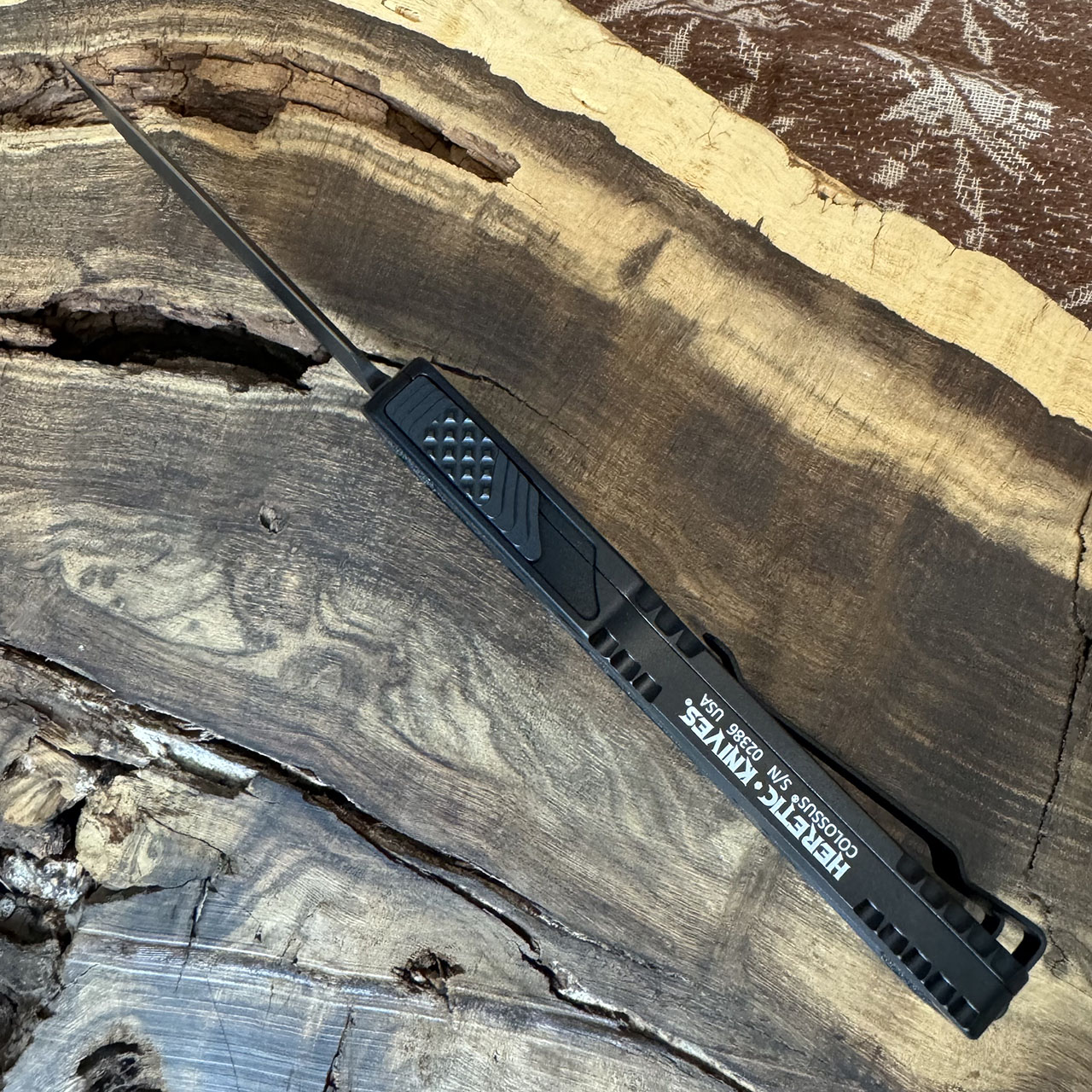 This model features black anodized aluminum handle scales with black grip inlays on both sides. DLC finished CPM-Magnacut stainless steel double edge blade. Matching hardware and pocket clip. The side of the frame is etched with the Heretic logo, model information, and serial number. Brand new in box.