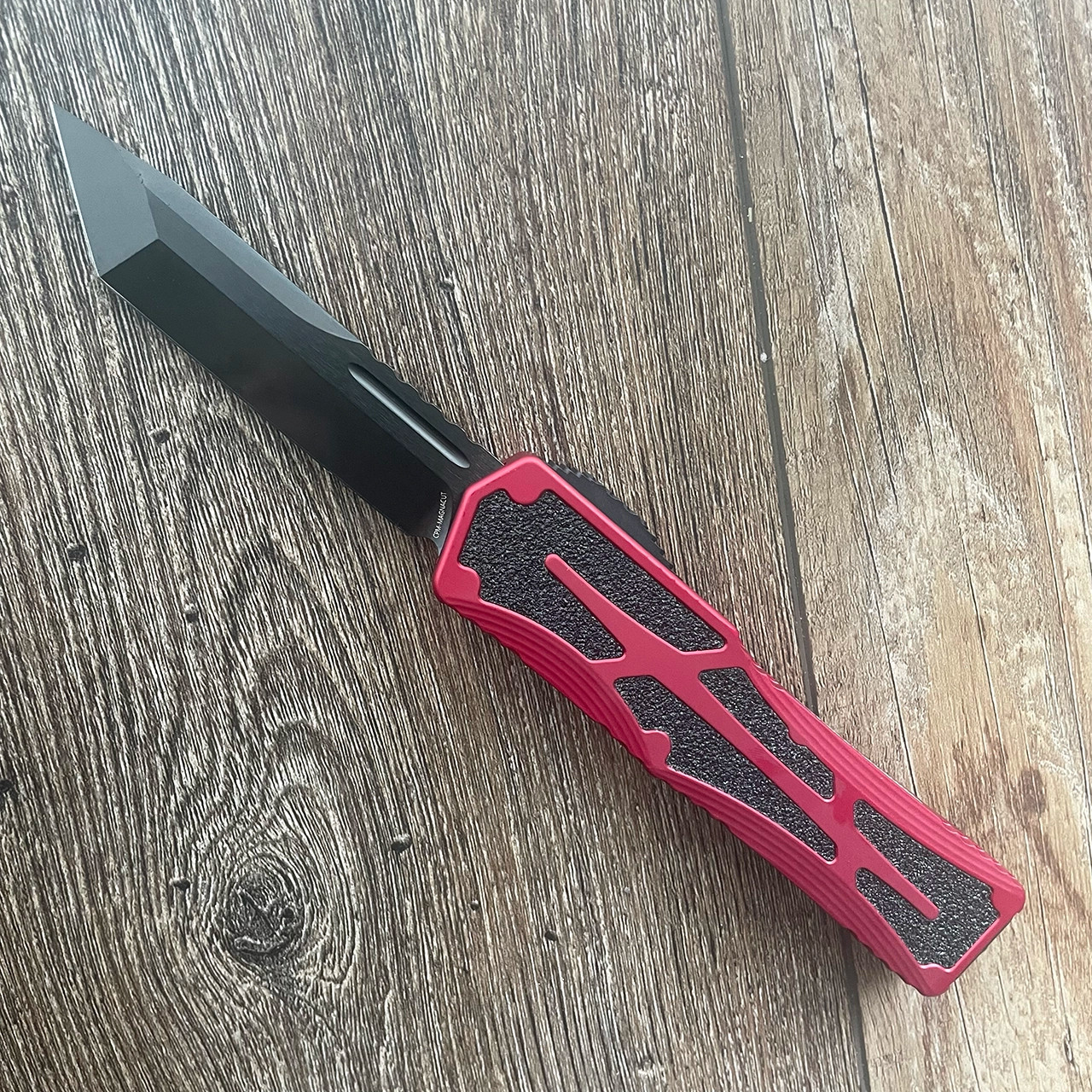 This model features red anodized aluminum handle scales with black grip inlays on both sides. DLC finished CPM-Magnacut stainless steel tanto blade with standard cutting edge. DLC finished hardware and pocket clip. The side of the frame is etched with the Heretic logo, model information, and serial number. Brand new in box.