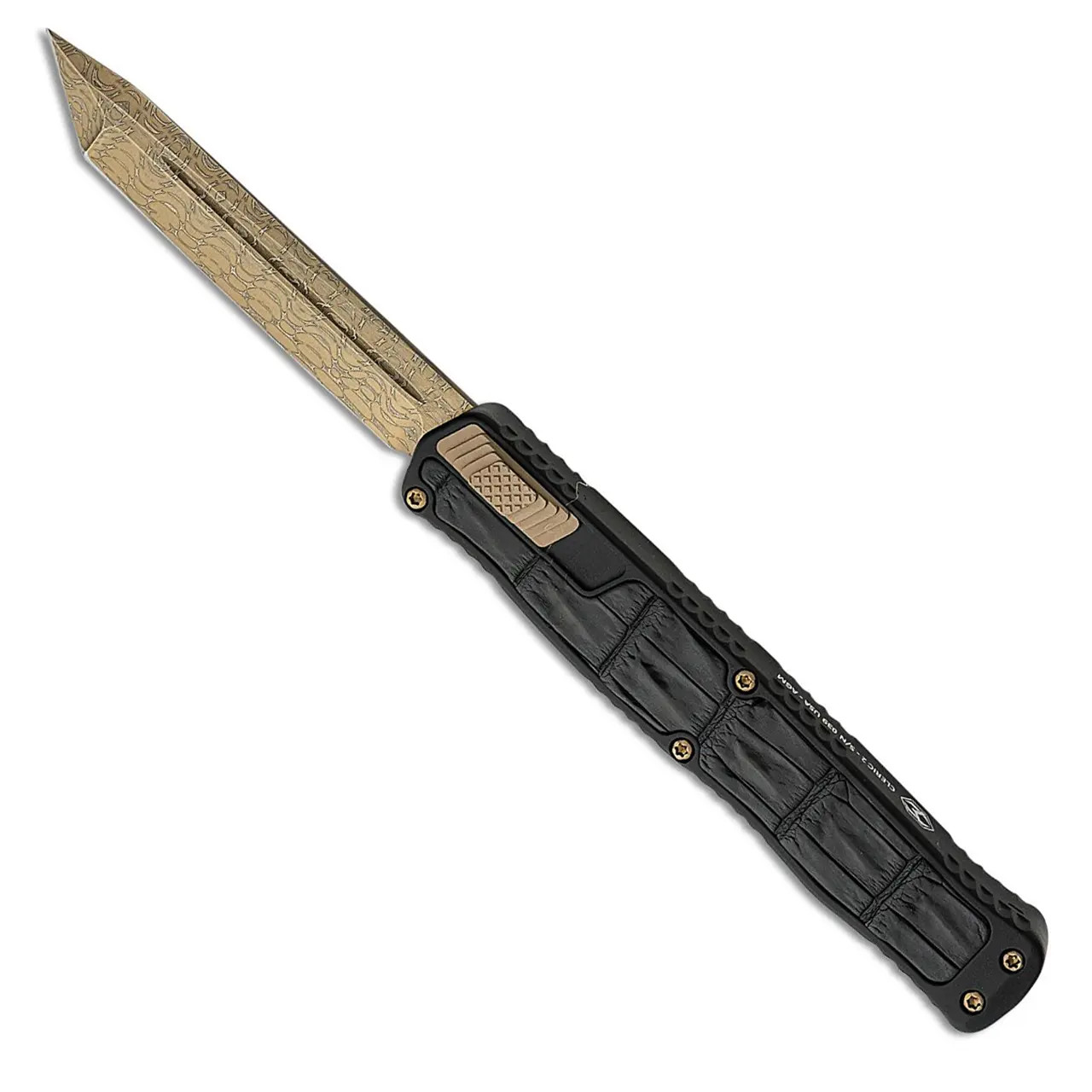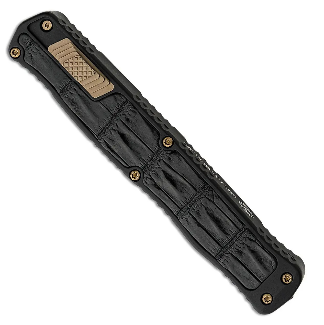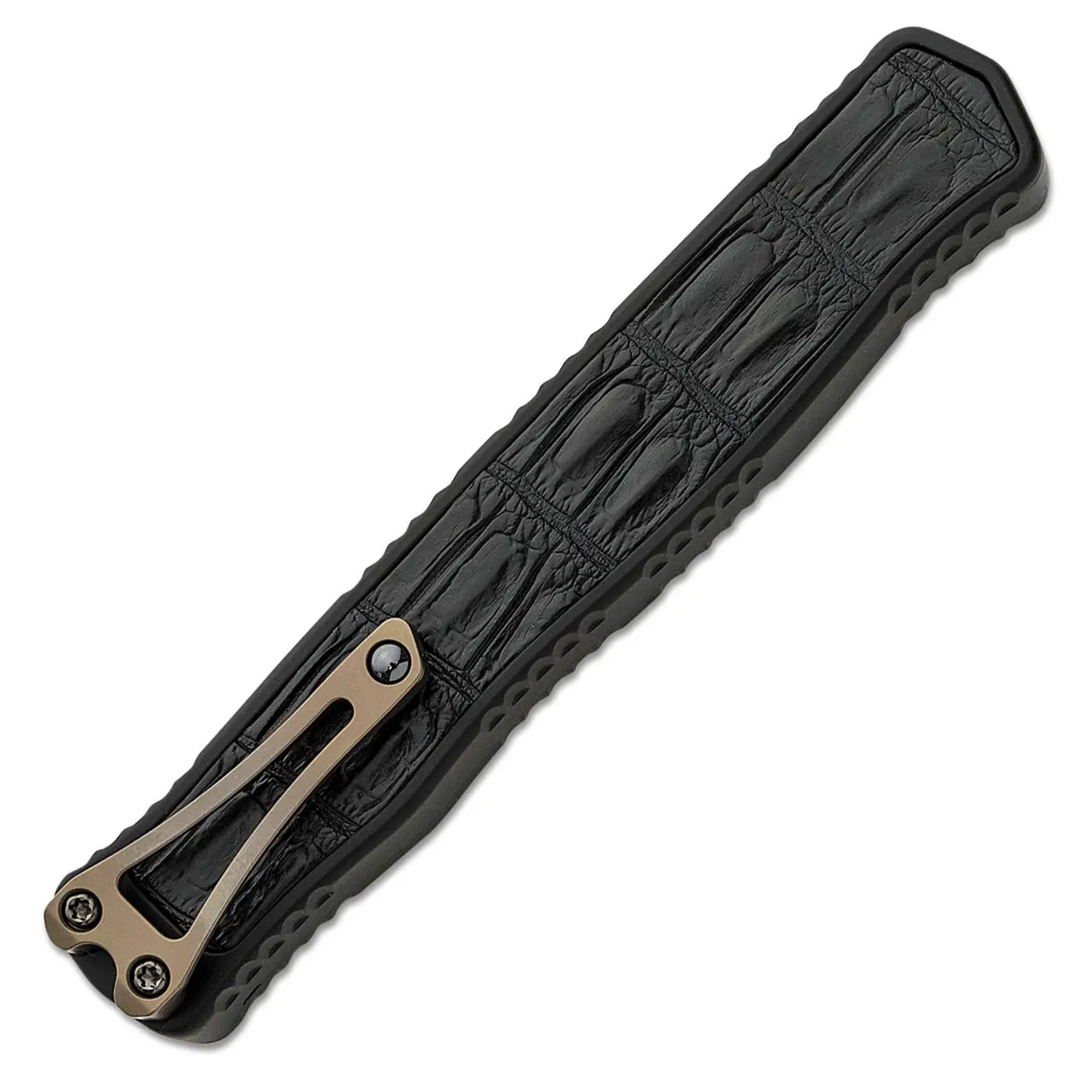 This limited custom model features black anodized aluminum handle scales with black crocodile inlays on both sides. Bronze finished hand ground Vegas Forge 3V damascus tanto blade. Bronze finished hardware, button, and milled titanium roller ball pocket clip. The side of the frame is etched with the Heretic logo, model information, and serial number. Brand new in box with pouch and COA.