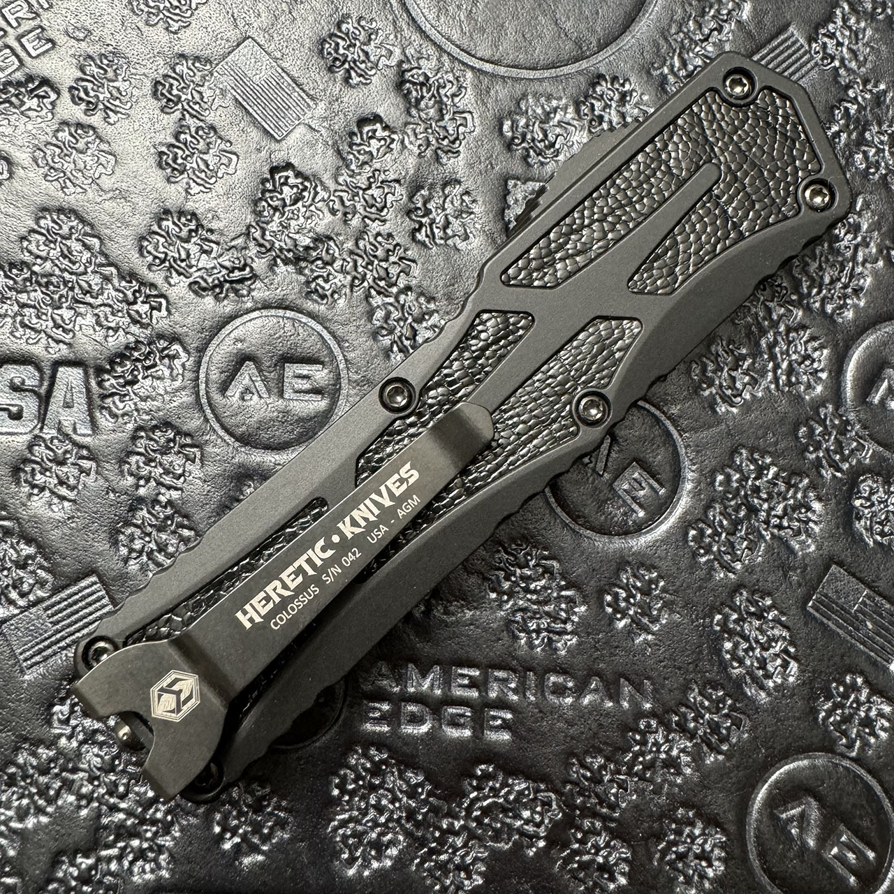 Heretic Knives Custom Colossus T/E Black Aluminum Handle w/ Ostrich Inlays Hand Ground Vegas Forge Blade