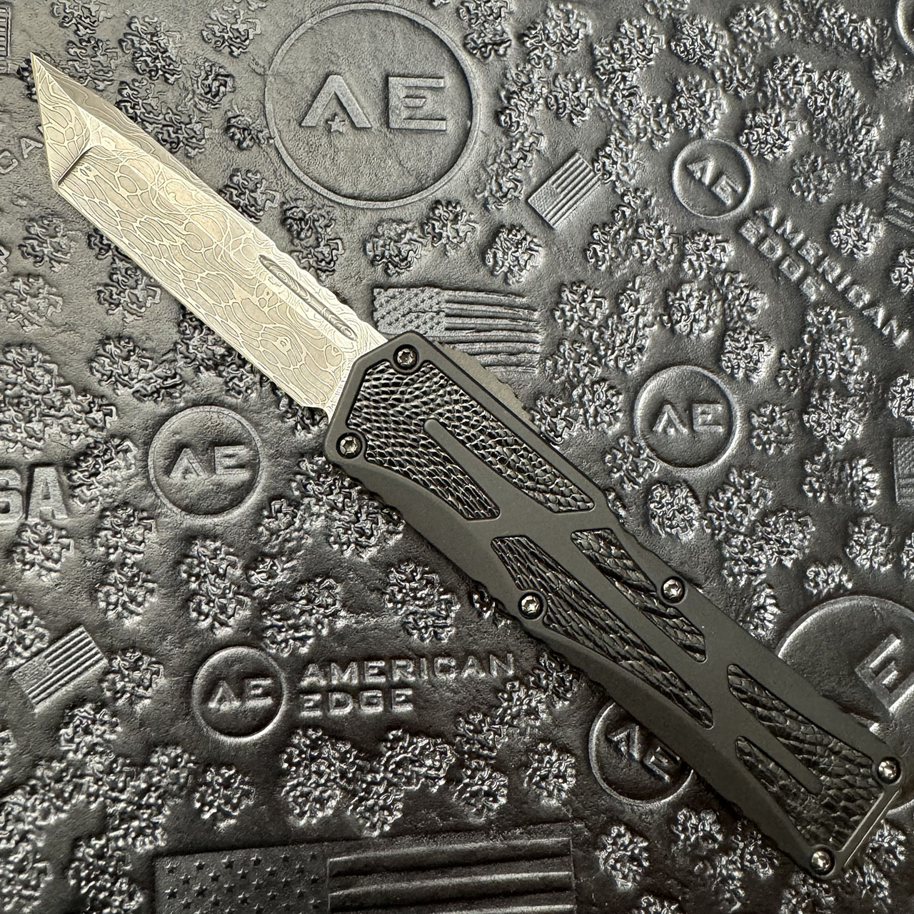 This model features black aluminum handles with ostrich inlays on both sides. Hand ground Vegas Forge tanto blade. DLC hardware and pocket clip, DLC button. Brand new in box with pouch and COA. Serial number 042.