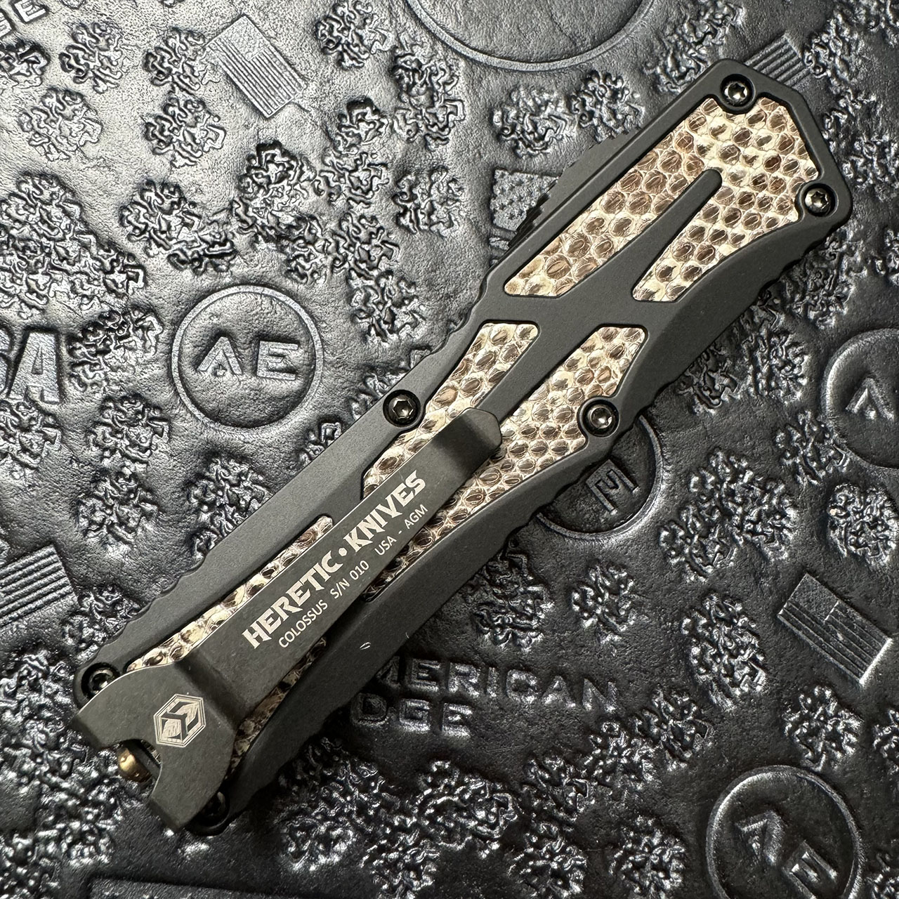Heretic Knives Custom Colossus T/E Black Aluminum Handle w/ White Monitor Lizard Inlays Hand Ground Vegas Forge Blade