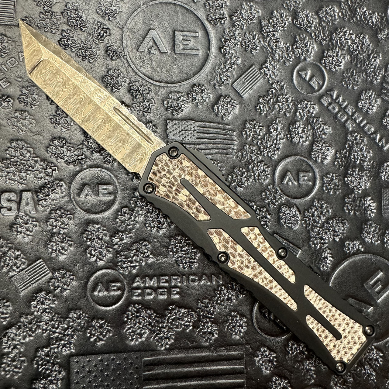 This model features black aluminum handles with white monitor lizard inlays on both sides. Hand ground Vegas Forge tanto blade. DLC hardware and pocket clip, DLC button. Brand new in box with pouch and COA. Serial number 010.