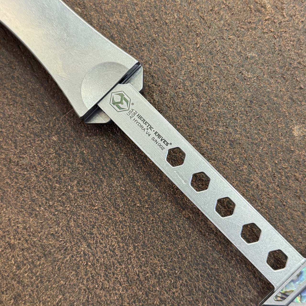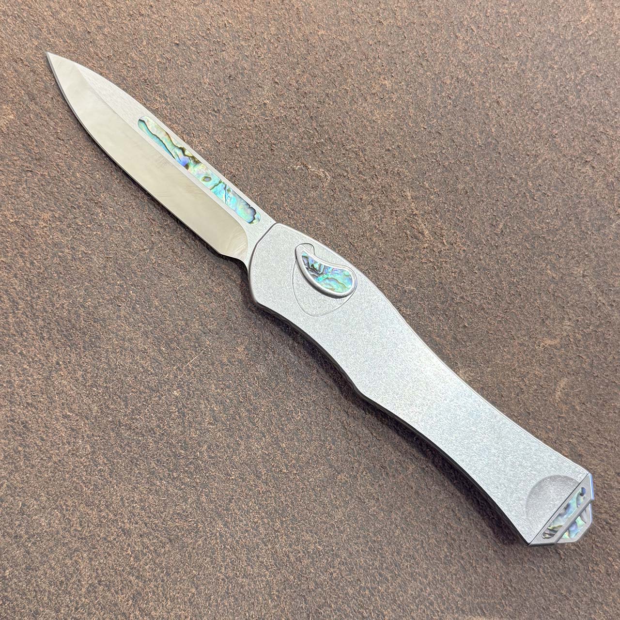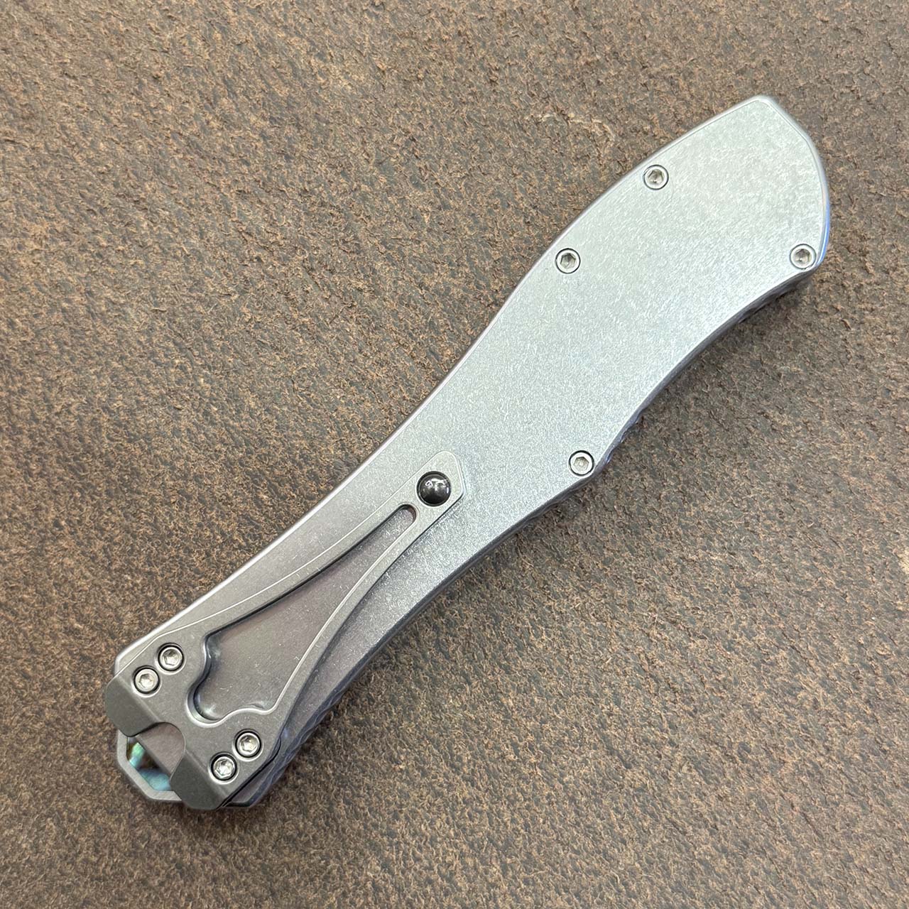 Heretic Knives Custom Hydra V4 OTF Auto S/E Stainless Steel Handle w/ Abalone Inlaid Button Cover, Button, Charging Handle, and Plate High Polish Blade