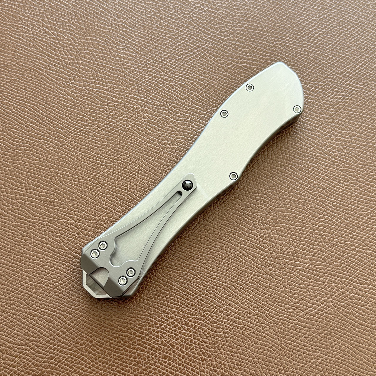 Heretic Knives Custom Hydra V4 OTF Auto T/E Stainless Steel Handle w/ Black Pearl Inlaid Button Cover, Button, Charging Handle, and Plate Mirror Polish Blade