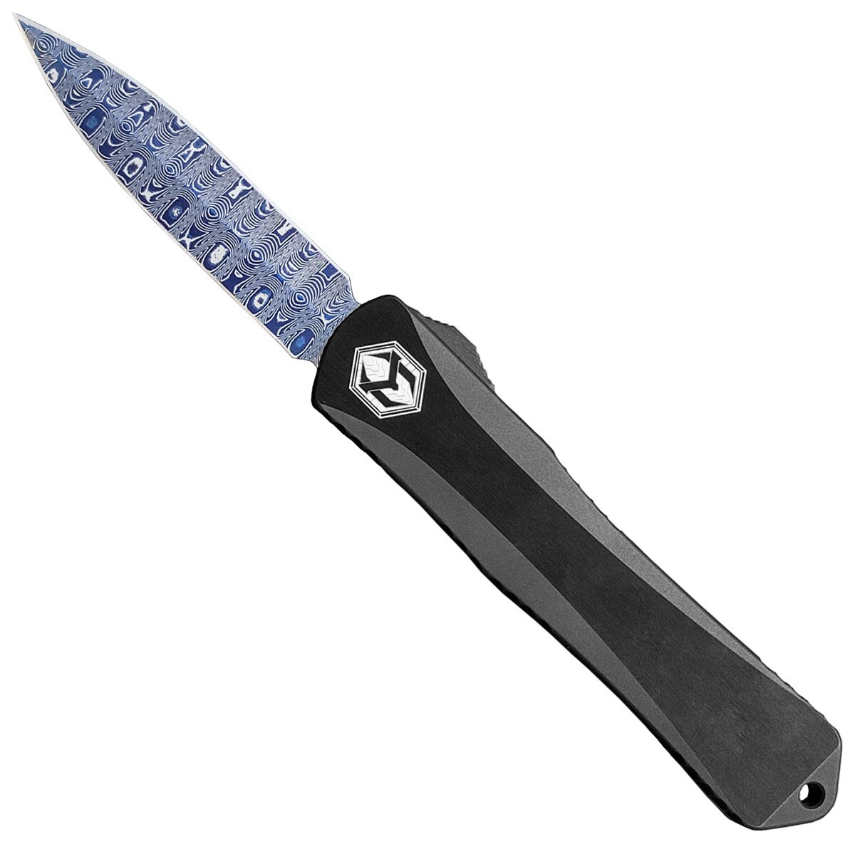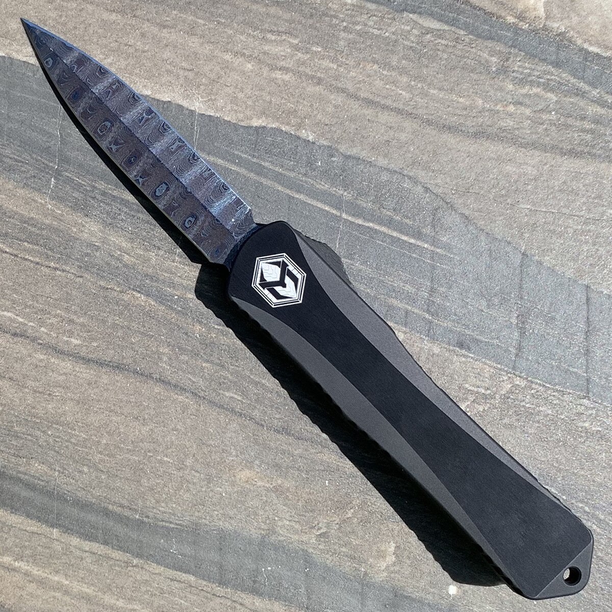 This custom model features black anodized 6061-T6 aluminum handle scales with hand rubbed satin finished flats. Hand ground polished blued Damascus double edge dagger blade. All black finished hardware and pocket clip. Carbon fiber button. The side of the frame is etched with the Heretic logo, model information, and serial number. The front of the handle has the Heretic Knives logo. Serial number #007 from Blade Show 2019. Brand new in custom box with cloth bag, zippered pouch, patch, and certificate of authenticity.