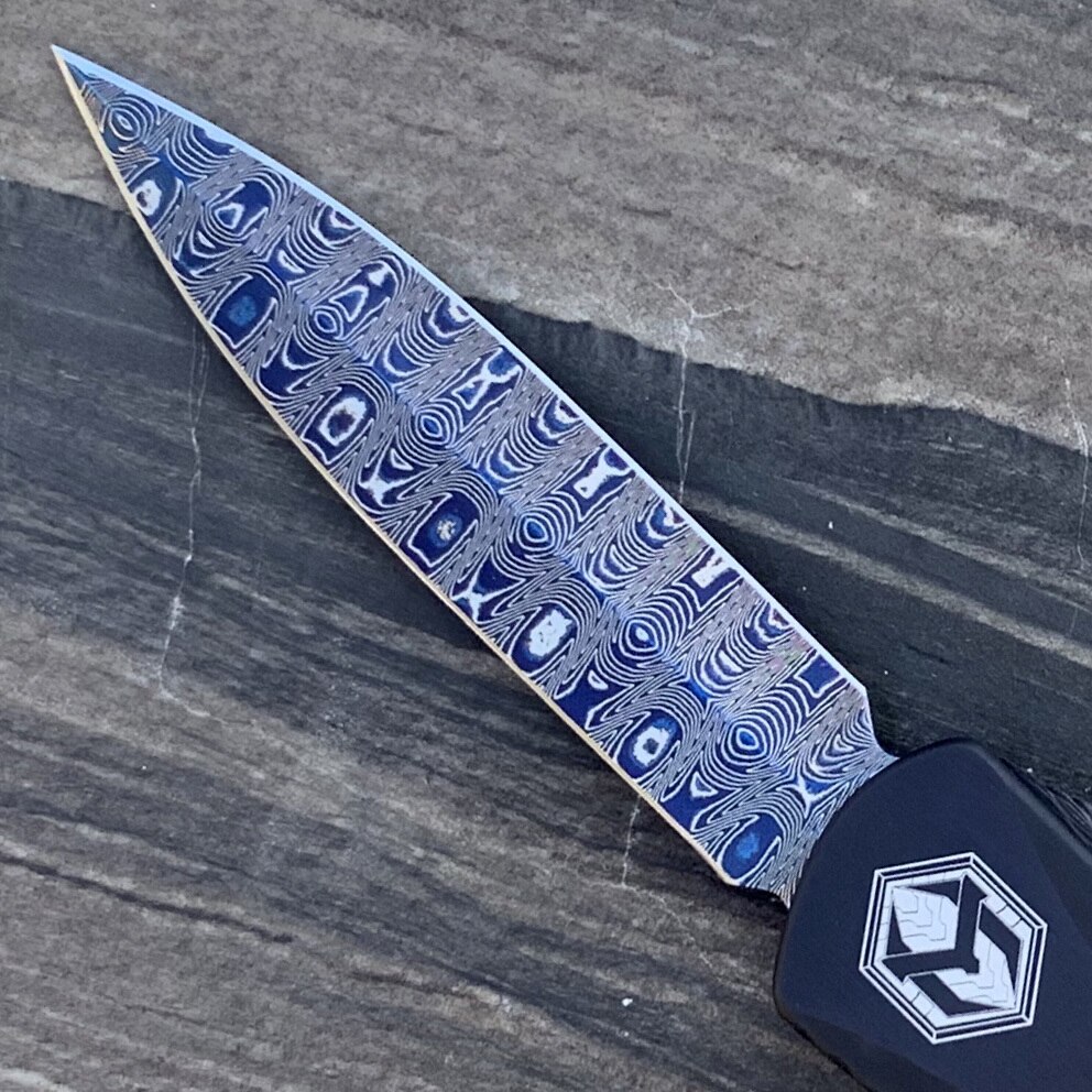 Heretic Knives Custom Manticore X D/E Hand Satin Aluminum Handle Hand Ground Blued Damascus Blade