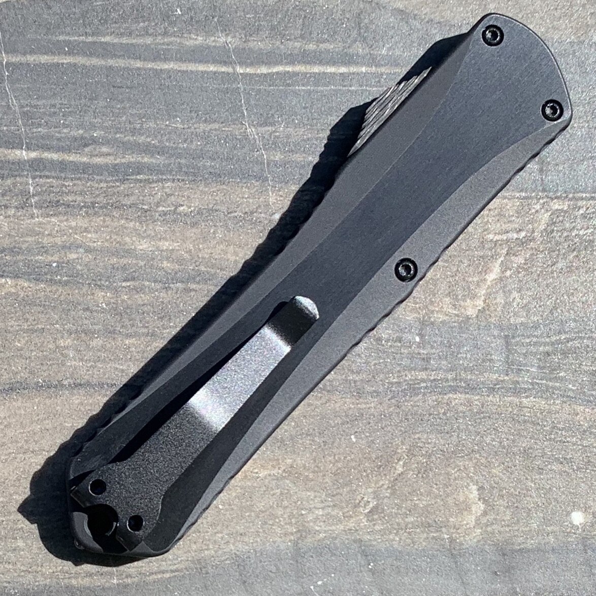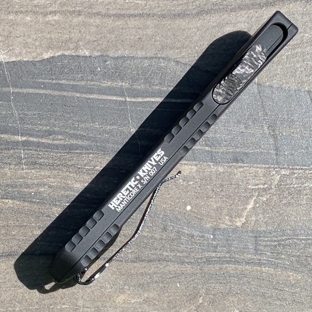 The Heretic Knives Manticore X is a double action out the front auto with top quality fit and finish, overbuilt toughness, and super smooth D/A OTF action! It features a side mounted thumb slide for easy operation. The handle has a subtle contour and jimping around the edges for a secure grip. Complete with a new deep carry pocket clip, built in lanyard hole (the handle tapers toward the base) and a glass breaker tip. This Heretic OTF is a home run!
