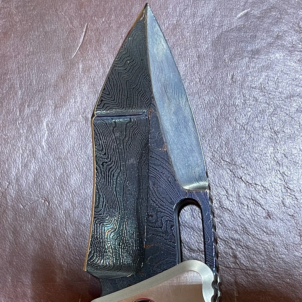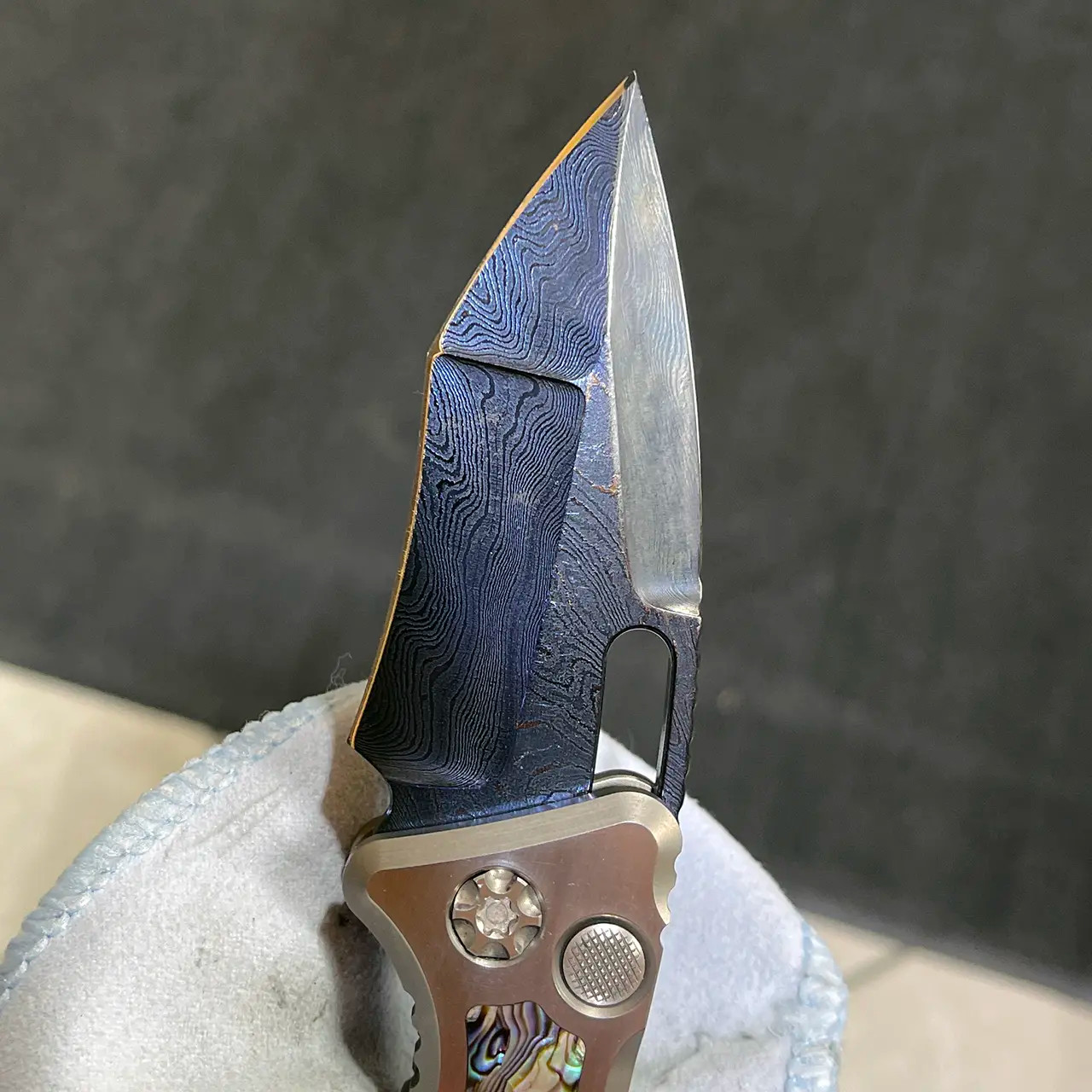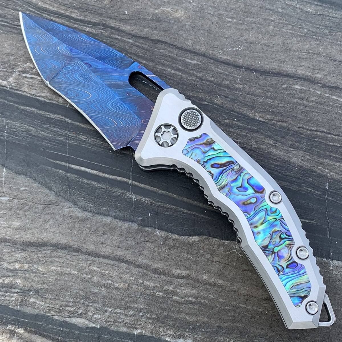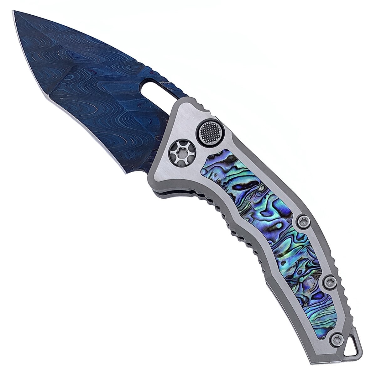 Heretic Knives Custom Medusa Auto Recurve Hand Satin Titanium w/ Abalone Handle Hand Ground Blued Damascus Blade (Pre-Owned)