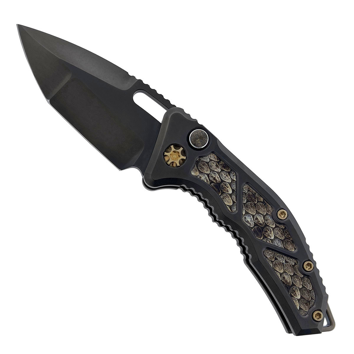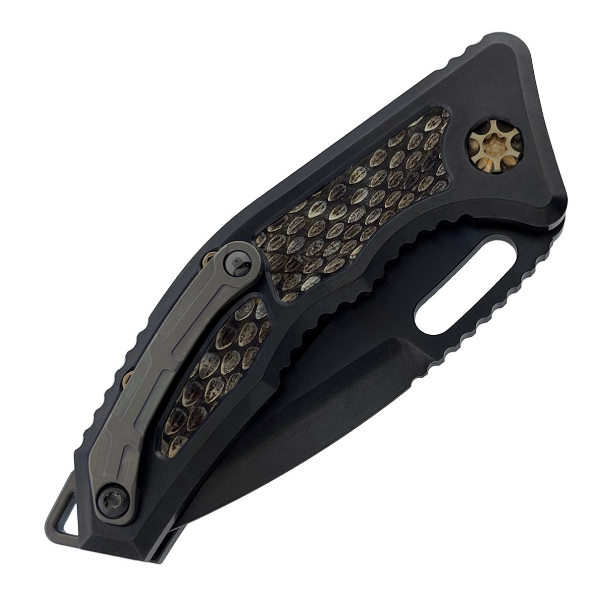 Heretic Knives Custom Medusa Auto Tanto DLC Titanium Handle w/ Rattlesnake Skin Inlays Hand Compound Ground DLC Blade Bronze Ti Hardware