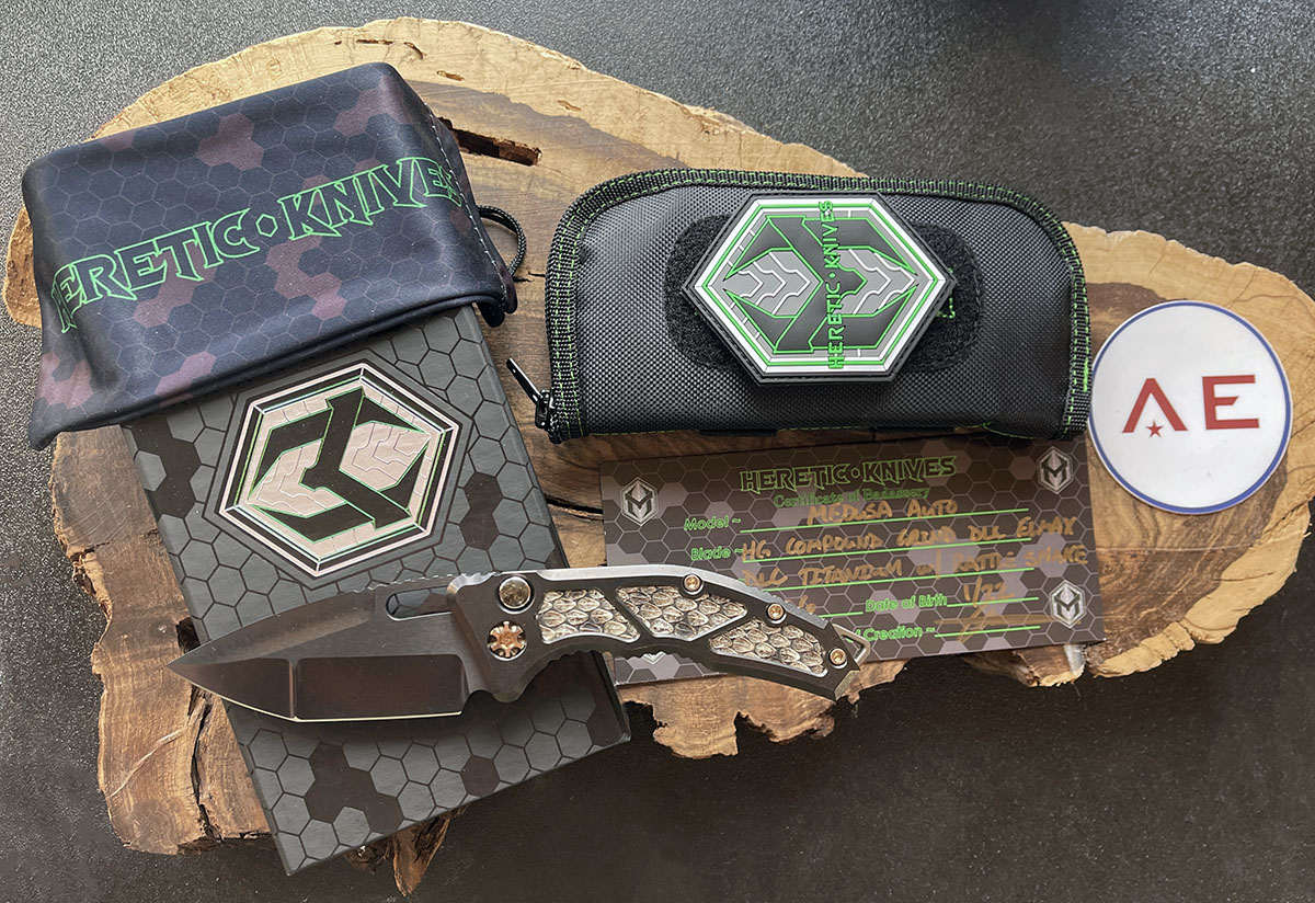 This custom model features black DLC finished titanium handle scales with genuine Rattlesnake skin inlays. Hand compound ground black DLC finished ELMAX stainless steel tanto blade. Bronze anodized titanium hardware, backspacer, and pocket clip. Gold matter fat carbon inlaid push. The inside of the backspacer has the Heretic Knives logo, model information, and serial number. A fantastic custom version of the Medusa auto from the Las Vegas Custom Knife Show 2022! Brand new in box.