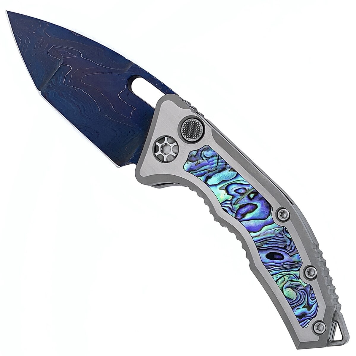 Heretic Knives Custom Medusa Auto Tanto Hand Satin Titanium w/ Abalone Handle Hand Ground Blued Damascus Blade (Pre-Owned)