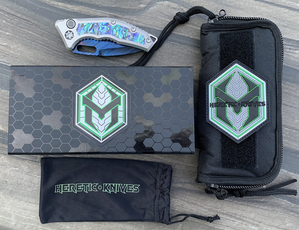 This beautiful custom model features a hand rubbed satin finished titanium frame with abalone inlays on both sides. Hand ground blued Damascus tanto blade. Titanium backspacer and hardware. Matching milled titanium pocket clip. The inside of the frame has the Heretic knives logo, serial number, and model information. From Blade Show 2019. Like new in box.