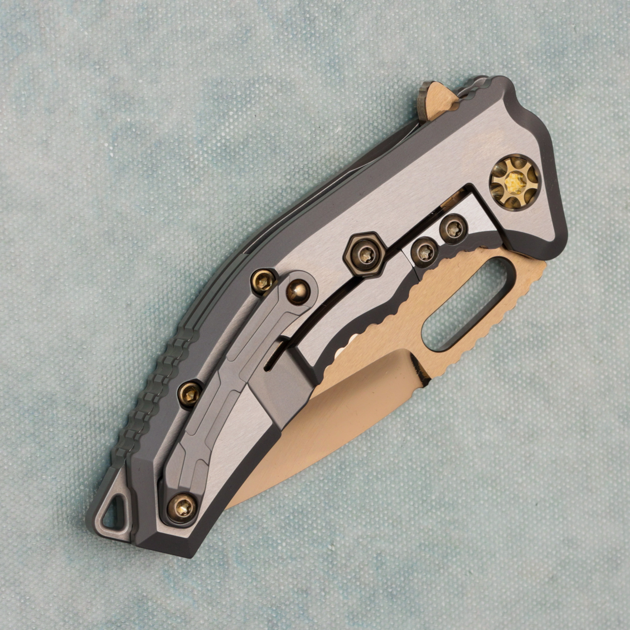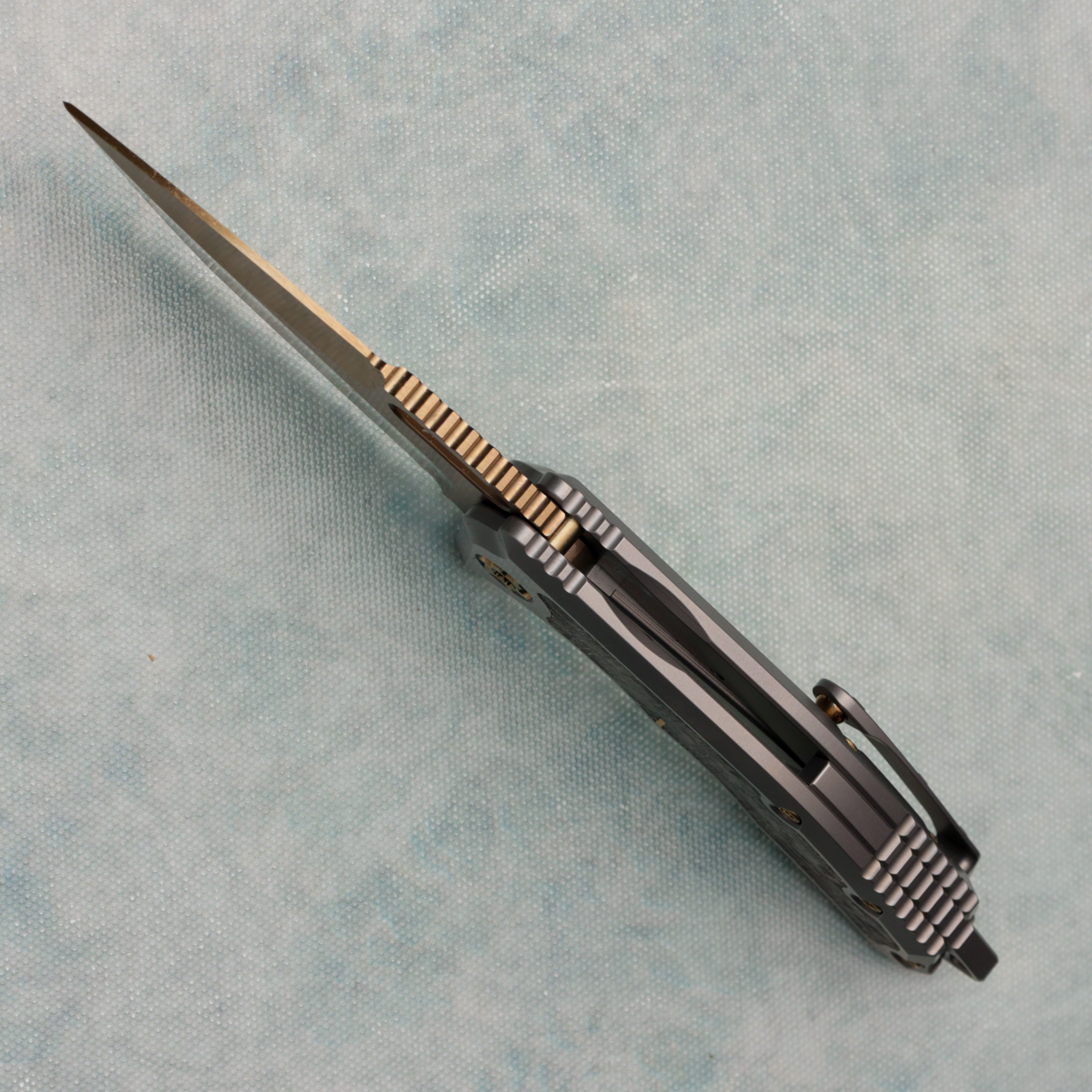 Heretic Knives Custom Medusa Manual Tanto Hefted Titanium Handle w/ Aletai Meteorite Inlay and Bronze Hardware Bronze Cracked Ice M390 Blade