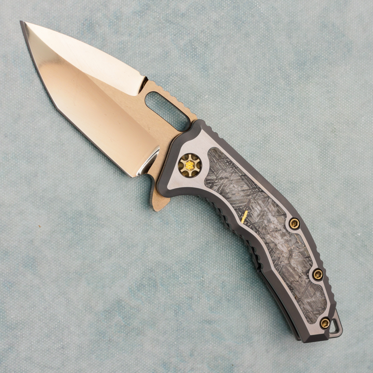 This custom model features hefted titanium handle scales with aletai meteorite Inlay with inset 24k gold (.16 grams). Bronze cracked ice M390 stainless steel tanto edge blade with standard cutting edge. This beauty features bronze Hardware. A fantastic custom version of the Medusa manual! Brand new in box.