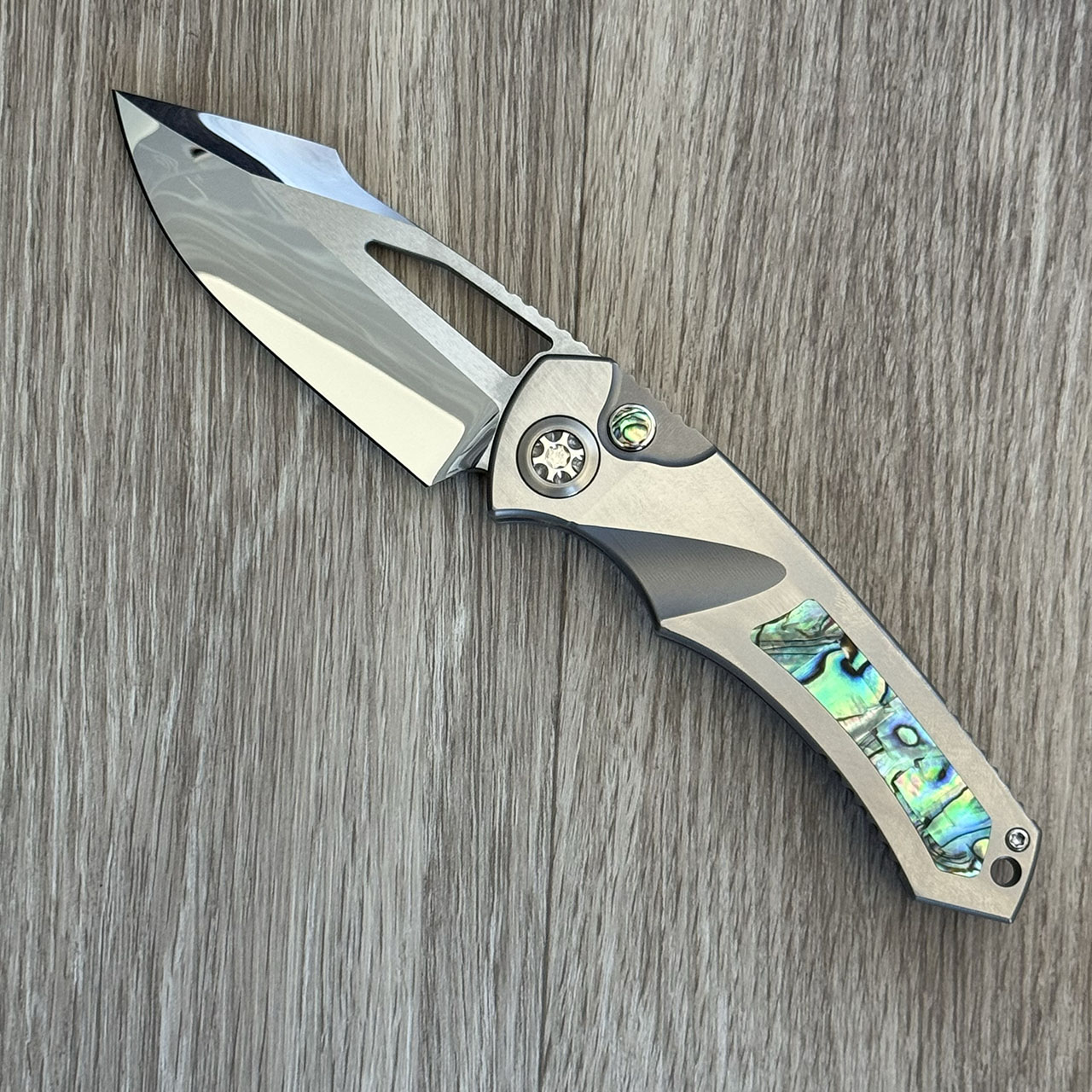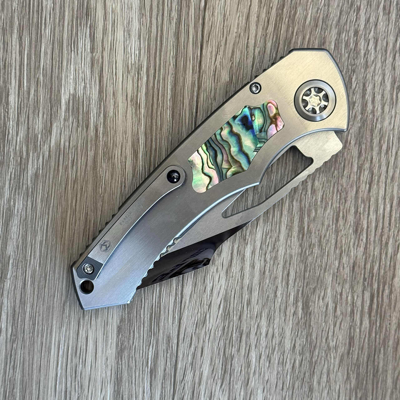 Heretic Knives Custom Pariah Manual S/E Hefted Titanium Handle w/ Abalone Inlays Mirror Polish Blade