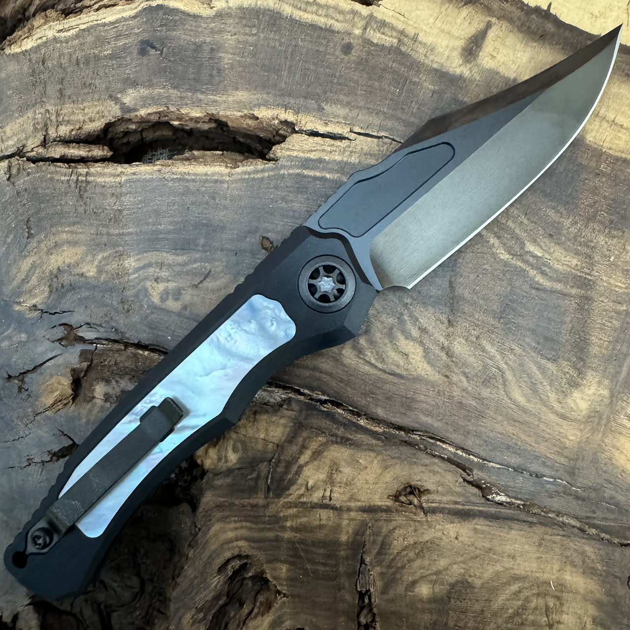 Heretic Knives Custom Wraith V4 Auto Bowie Hefted Aluminum Handles w/ Mother of Pearl Inlays High Sheen DLC Blade DLC Hardware