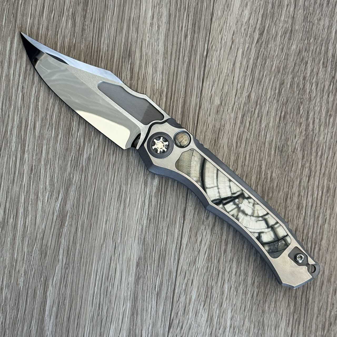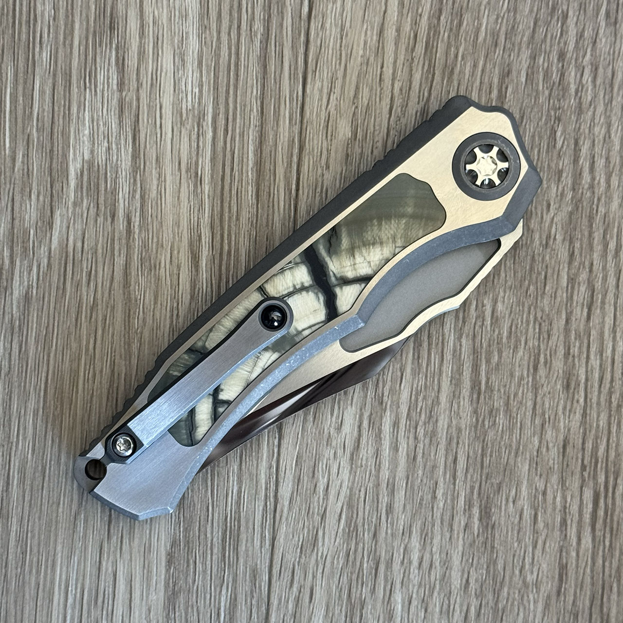 Heretic Knives Custom Wraith V4 Auto Bowie Hefted Titanium Handle w/ Cross Cut Mammoth Tusk Inlays Mirror Polish Blade