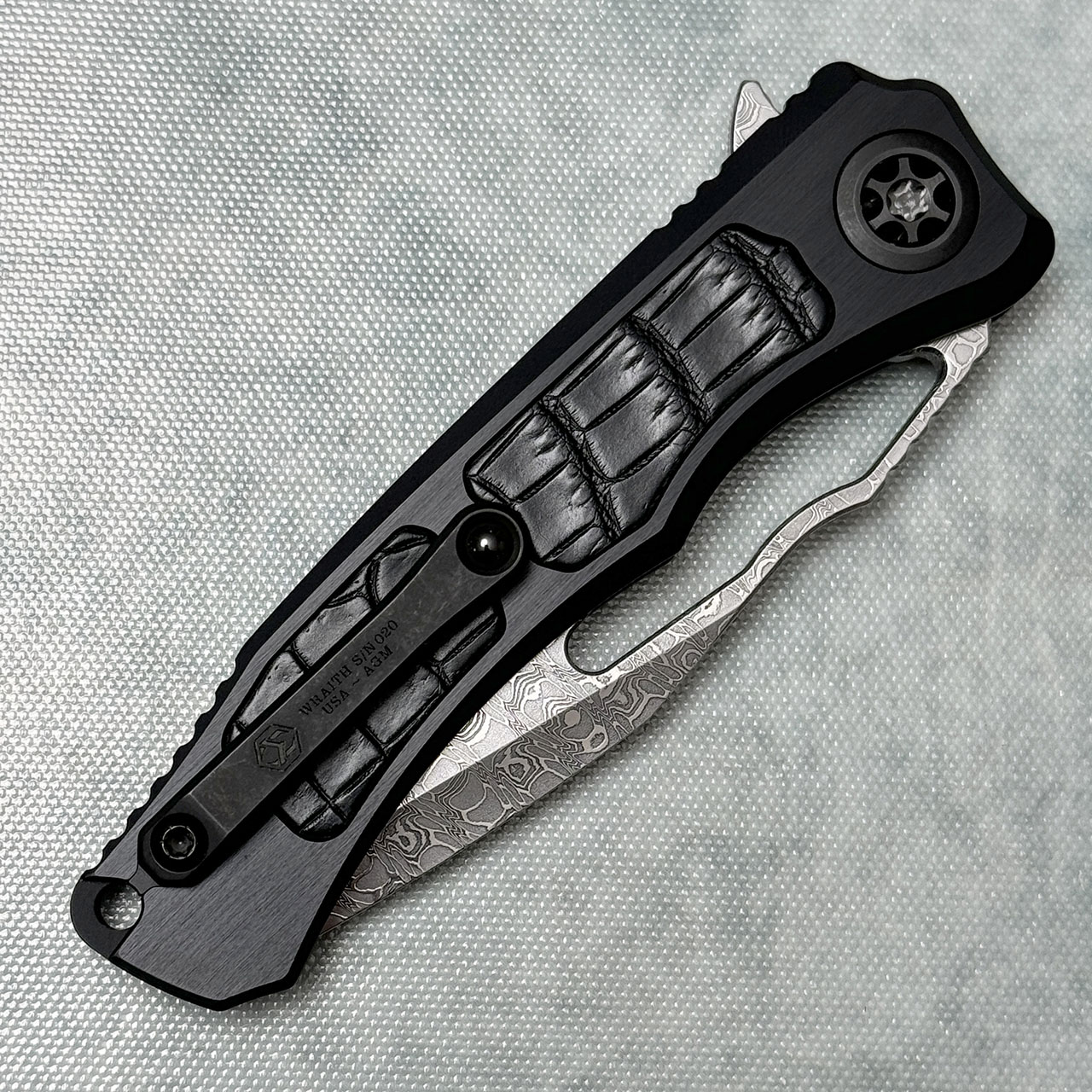 Heretic Knives Custom Wraith V4 Manual Bowie Hefted Aluminum Handle w/ Croc Skin Inlays Vegas Forge Reptilian Damascus Blade