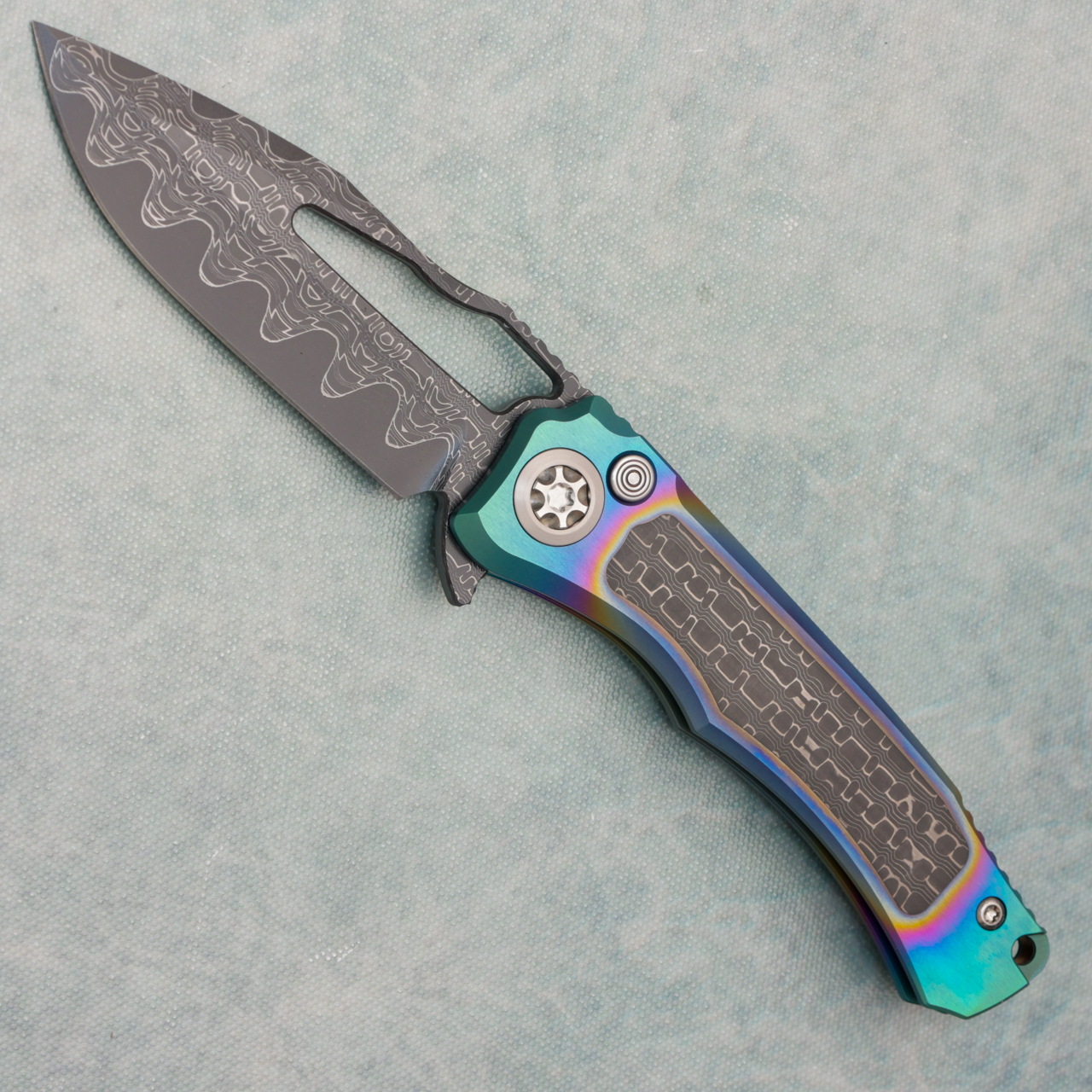Heretic Knives Custom Wraith V4 Manual Bowie Hefted Prismatic Titanium Handle w/ Damascus Inlays Vegas Forge SanMai Reptilian Damascus Blade