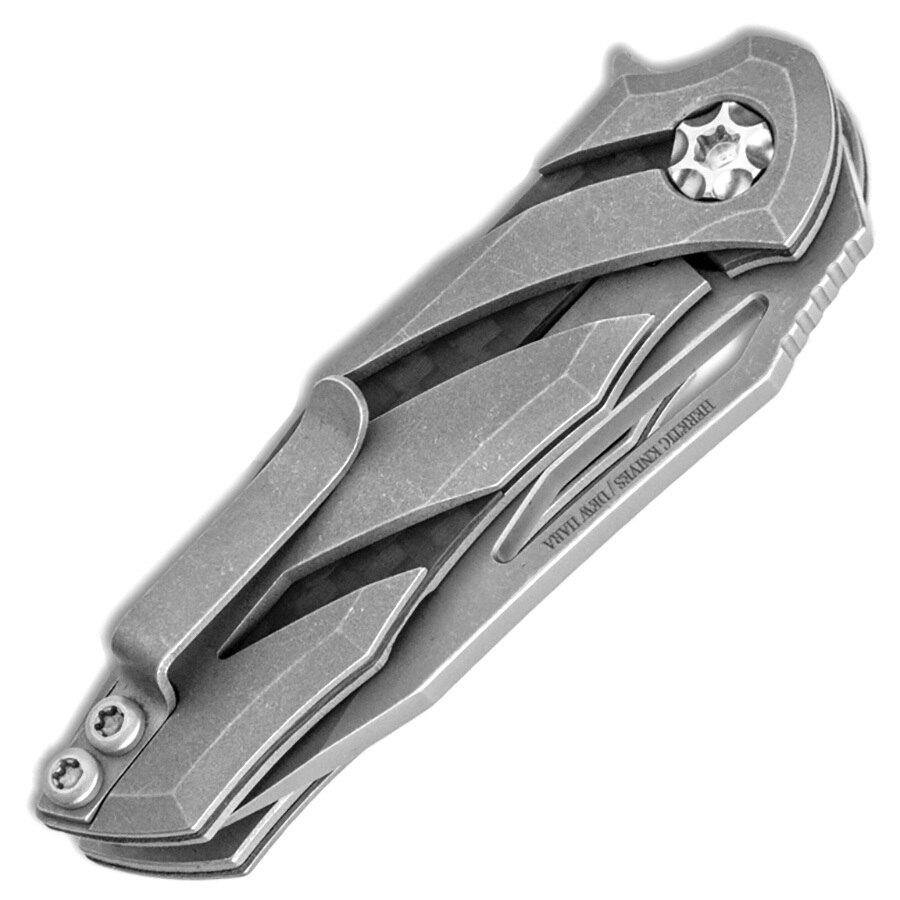 This model features battleworn titanium handle scales with a carbon fiber underlay. Battleworn finished CPM-S35VN stainless steel recurve tanto blade. Satin finished pivot and barrel spacer. Battleworn finished pocket clip. The blade is etched with the Heretic logo, serial number, and model information. Brand new in box with Heretic Knives cloth bag.