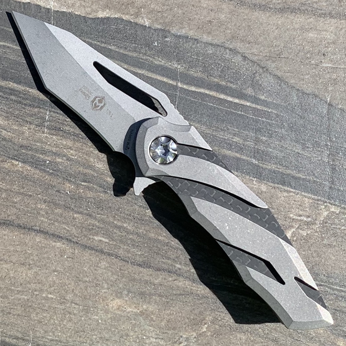 Heretic Knives Dew Hara Tenshi Liner Lock Recurve Battleworn Titanium/Carbon Fiber Handle Battleworn Blade H036-5A
