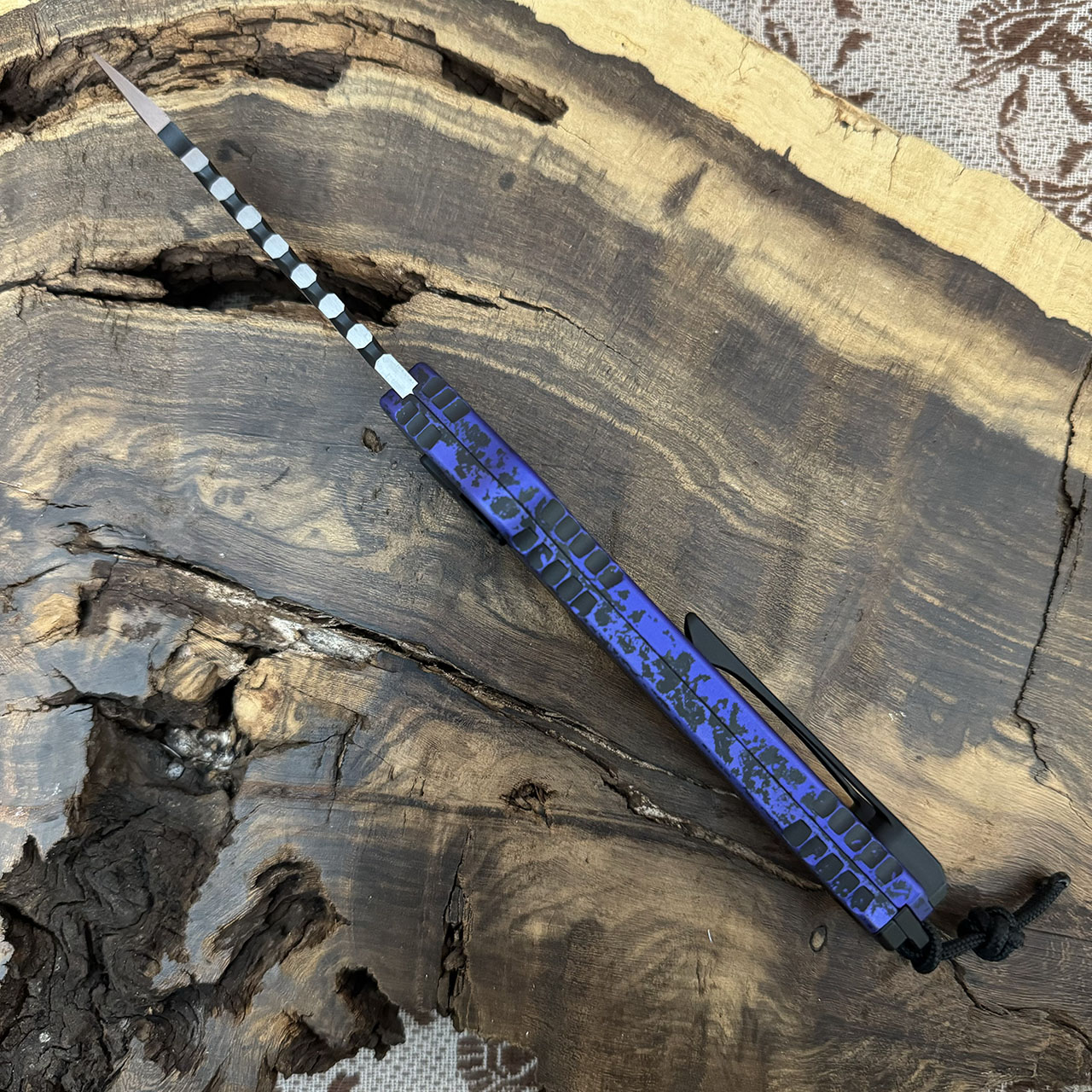 This model features breakthrouhg purple anodized 6061-T6 aluminum handle scales. Two Tone DLC finished Magnacut stainless steel recurve blade. Black finished hardware and pocket clip. The charging bar is etched with the Heretic logo, model information, and serial number. Brand new in box.