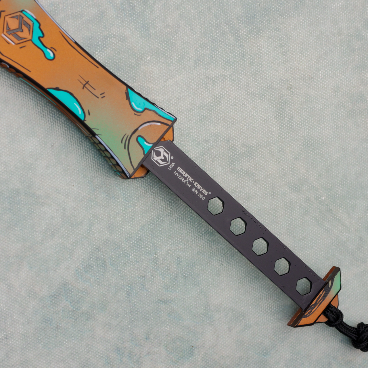 This V4 model features shipwreck cel shade 6061-T6 aluminum handle scales. Matching Magnacut stainless steel single edge recurve blade. The charging bar is etched with the Heretic logo, model information, and serial number. Brand new in box.