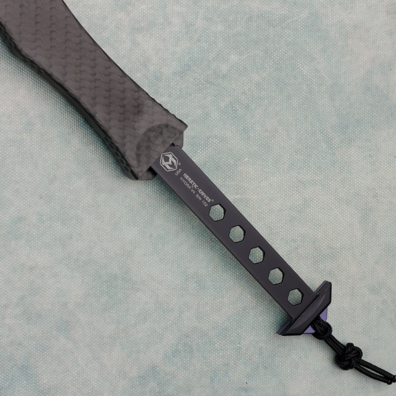 This V4 model features carbon fiber handle scales. DLC MagnaCut stainless steel Tanto edge blade. Blue titanium button cover and clip. The charging bar is etched with the Heretic logo, model information, and serial number. Brand new in box.