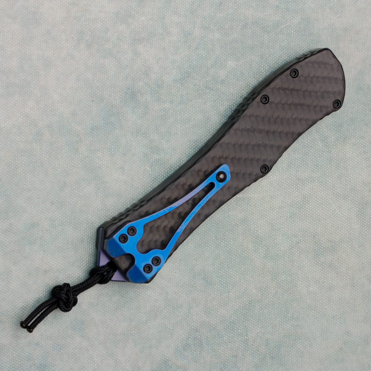Heretic Knives Hydra V4 T/E OTF Auto Carbon Fiber Handle DLC MagnaCut Blade Blue Titanium Accents H406-6A-CF-BLUTI