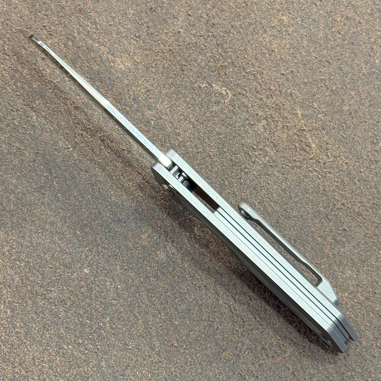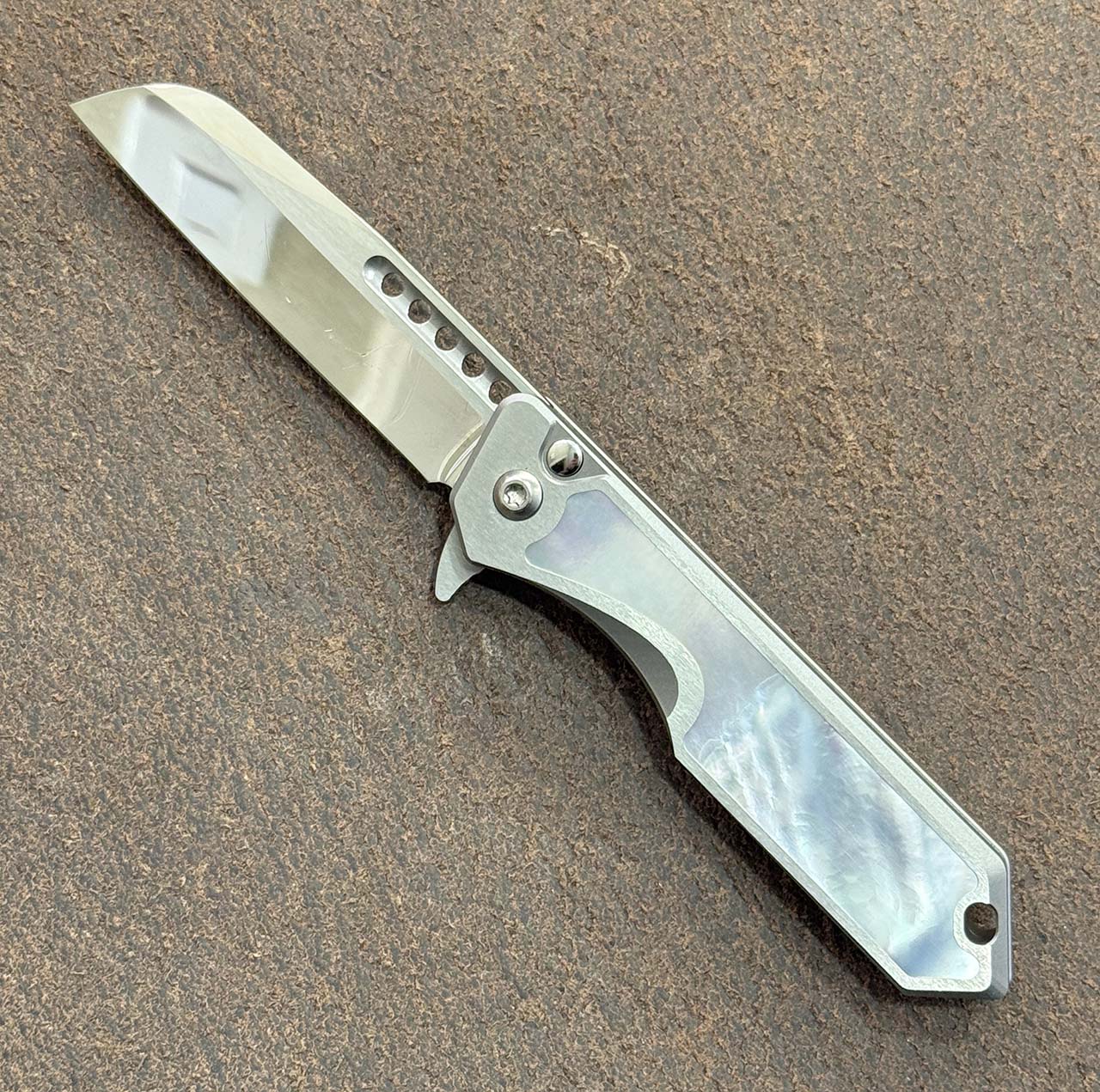 This custom model features titanium handle scales with mother of pearl inlays. Hand ground cracked ice M390 sheepsfoot blade. Brand new in box.