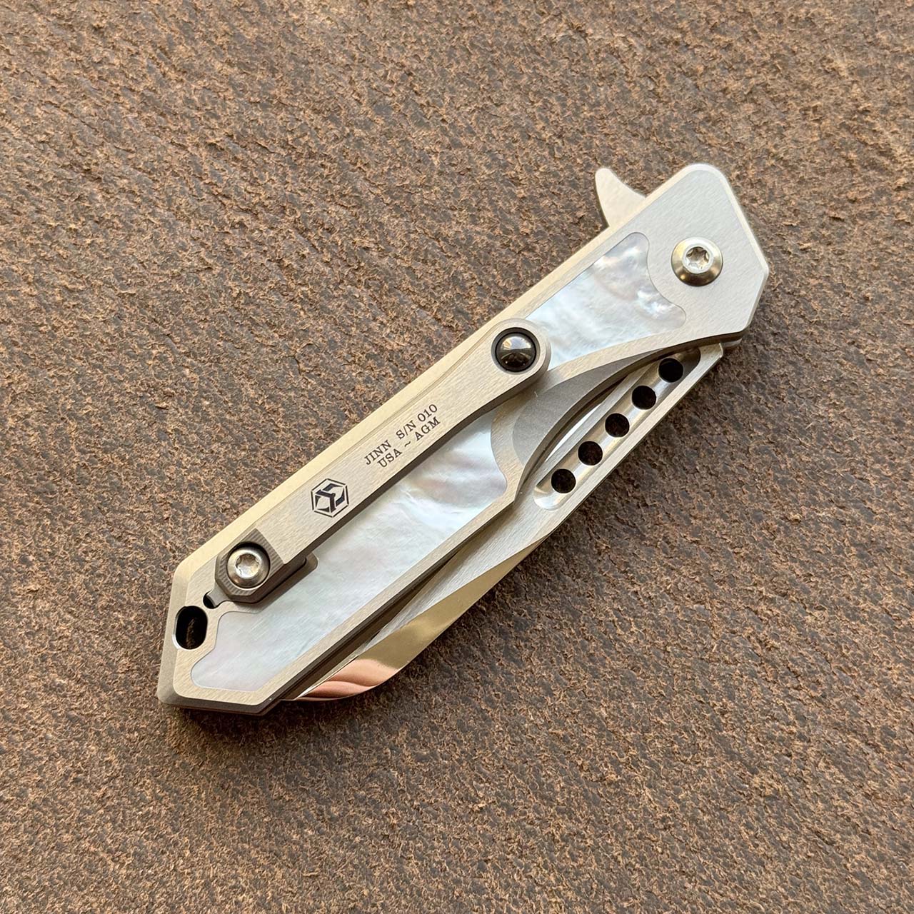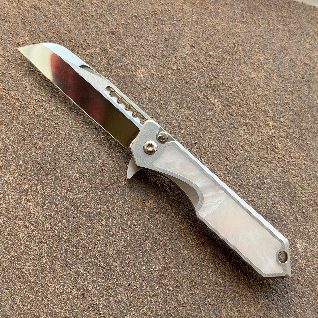 This custom model features titanium handle scales with mother of pearl inlays. Hand ground cracked ice M390 sheepsfoot blade. Brand new in box.