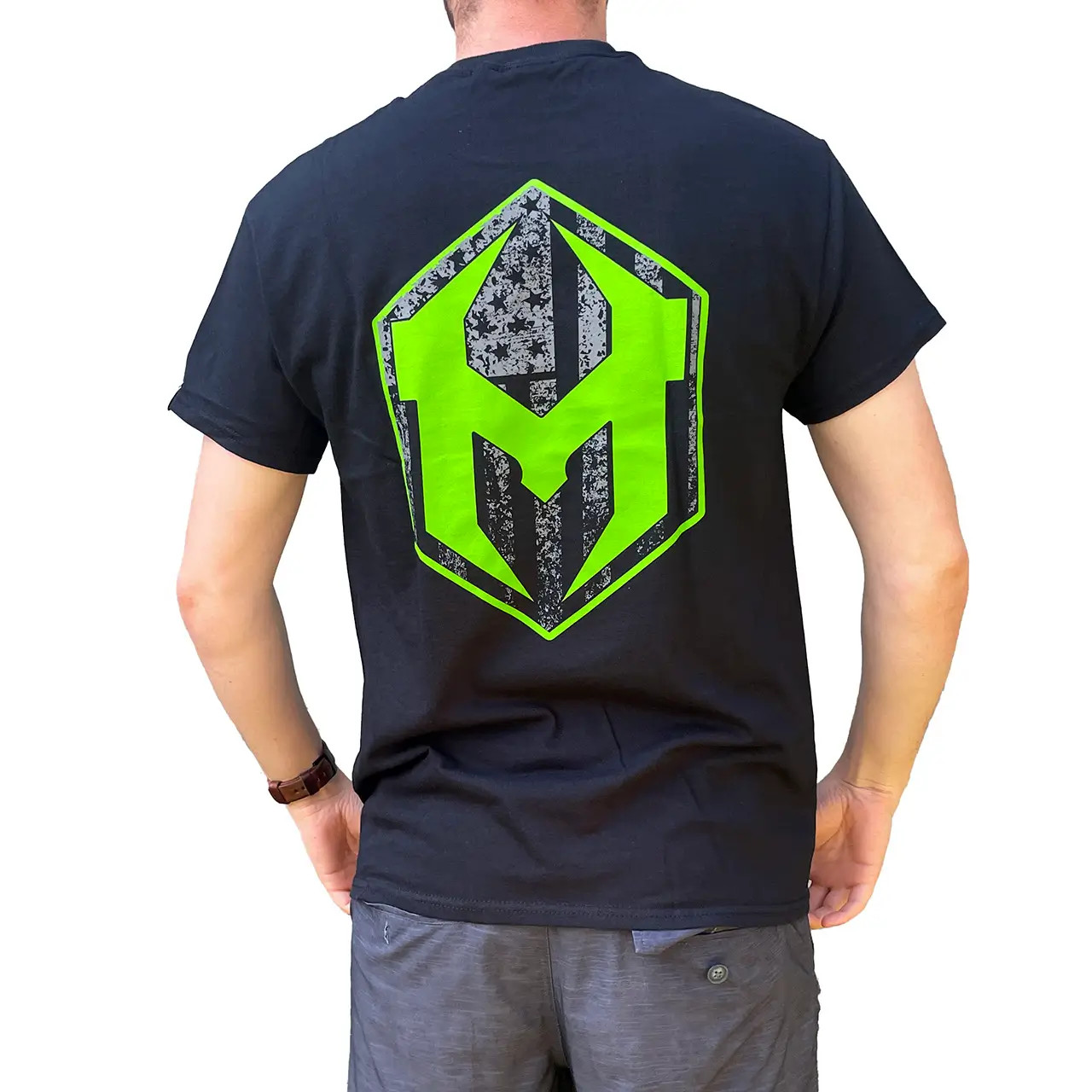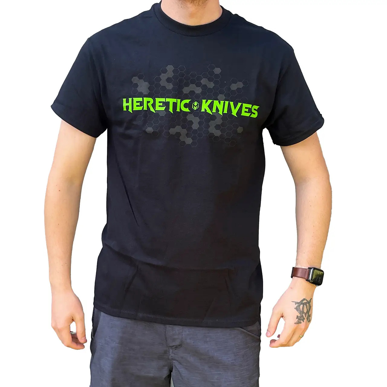 100% cotton Heretic Knives T-Shirt featuring the green Heretic logo on the back and "Heretic Knives" with hex background on front. Brand new.