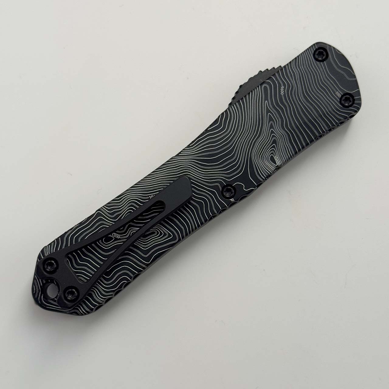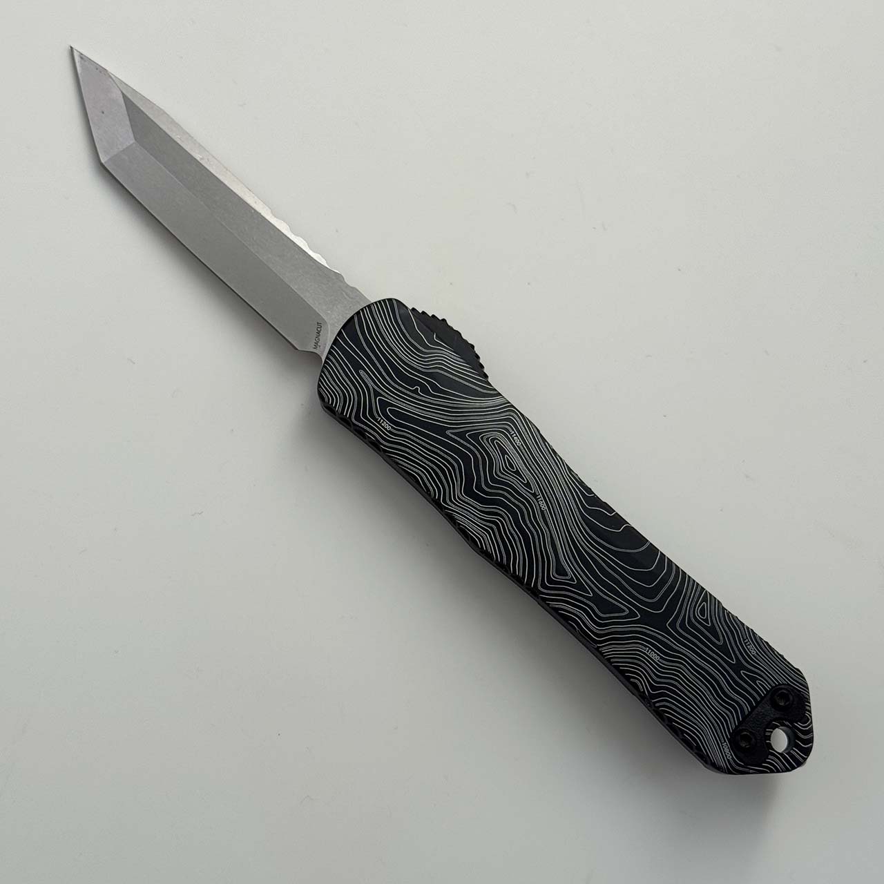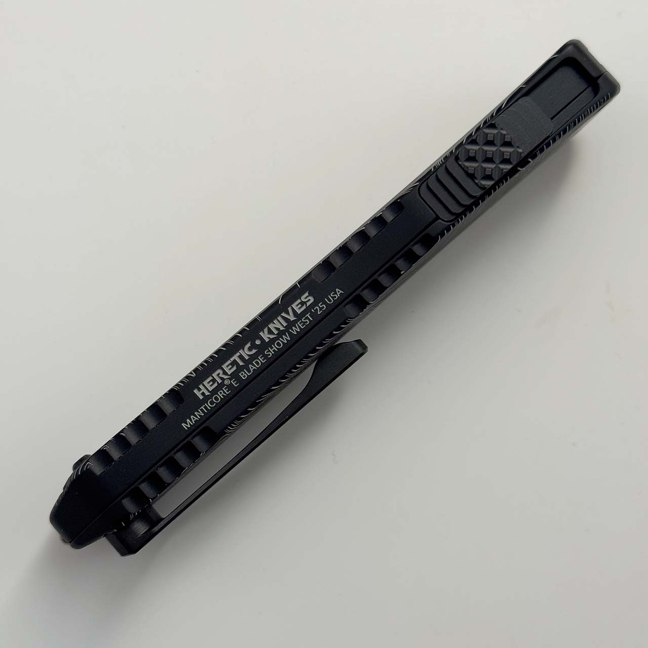 This show special model features black anodized 6061-T6 aluminum handle scales with top map engraving of one of the mountains in Utah. Stonewash finished CPM-Magnacut stainless steel tanto blade. Black finished hardware and pocket clip. Matching thumb slide button. The side of the frame is etched with the Heretic logo, model information, and serial number. Brand new in box.