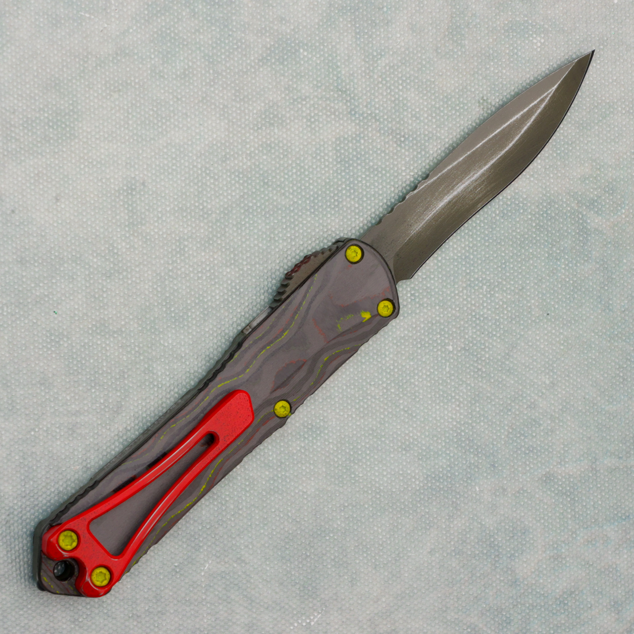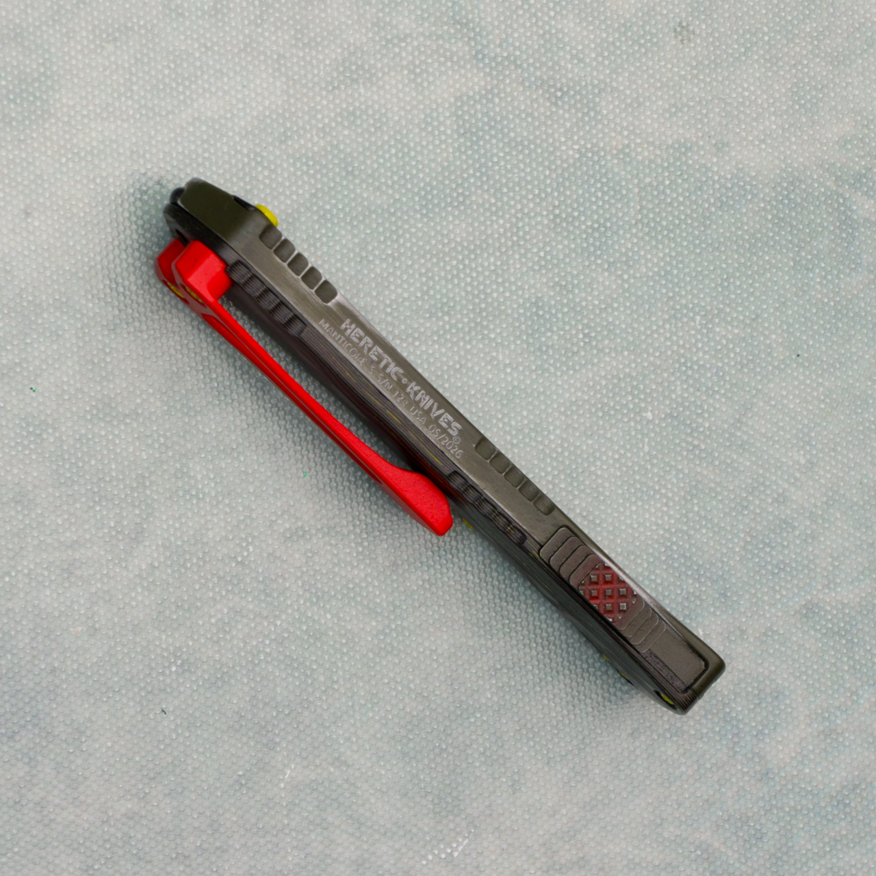 The Heretic Knives Manticore S is a smaller office friendly double action out the front auto with top quality fit and finish and super smooth action! It features a side mounted thumb slide for easy operation. The handle has a subtle contour and jimping around the edges for a secure grip. Complete with a deep carry pocket clip, built in lanyard hole (the handle tapers toward the base), and glass breaker tip. This mini Heretic OTF auto is fantastic!